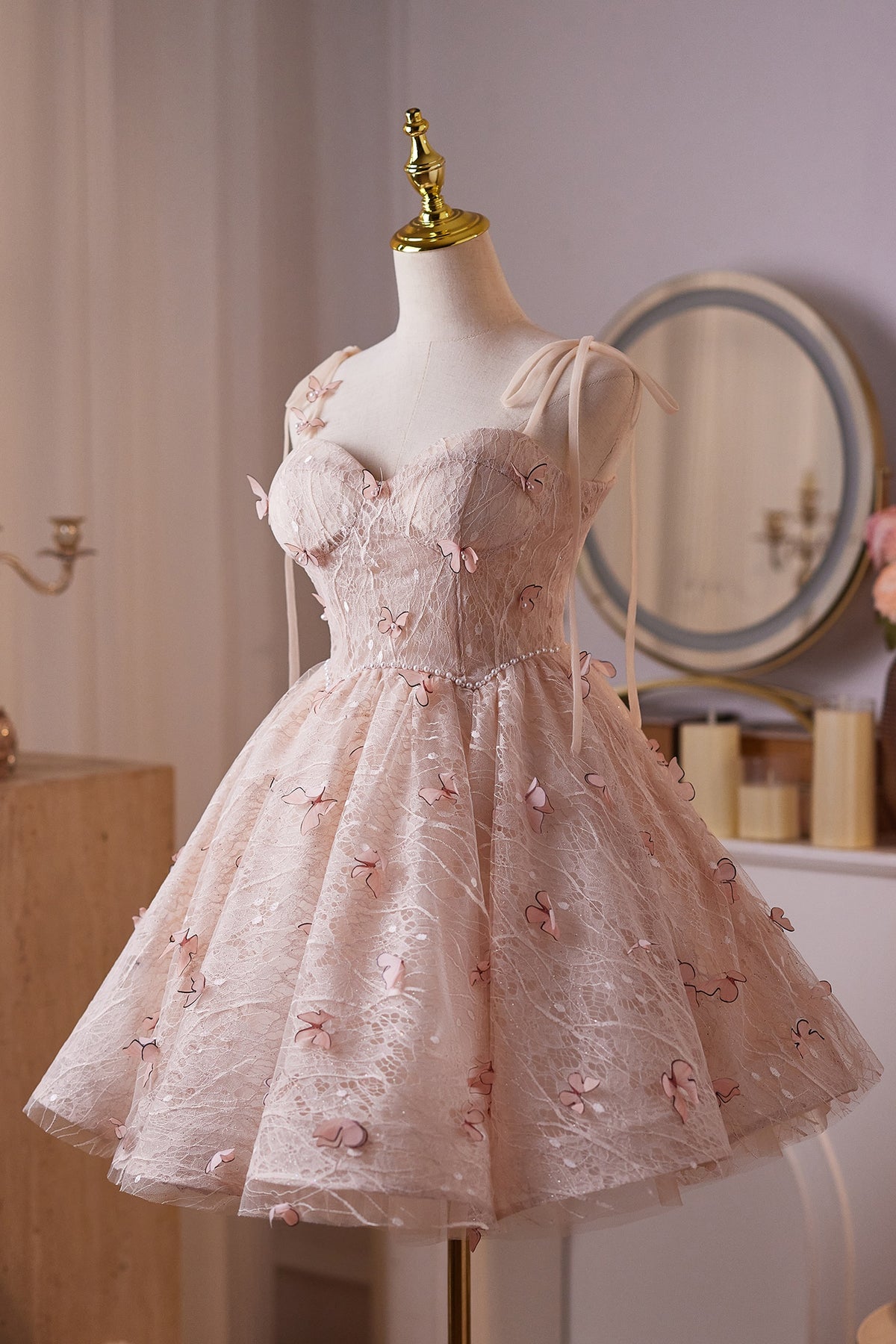 A-line Pearl and 3D Butterfly Light Pink Puffy Dress