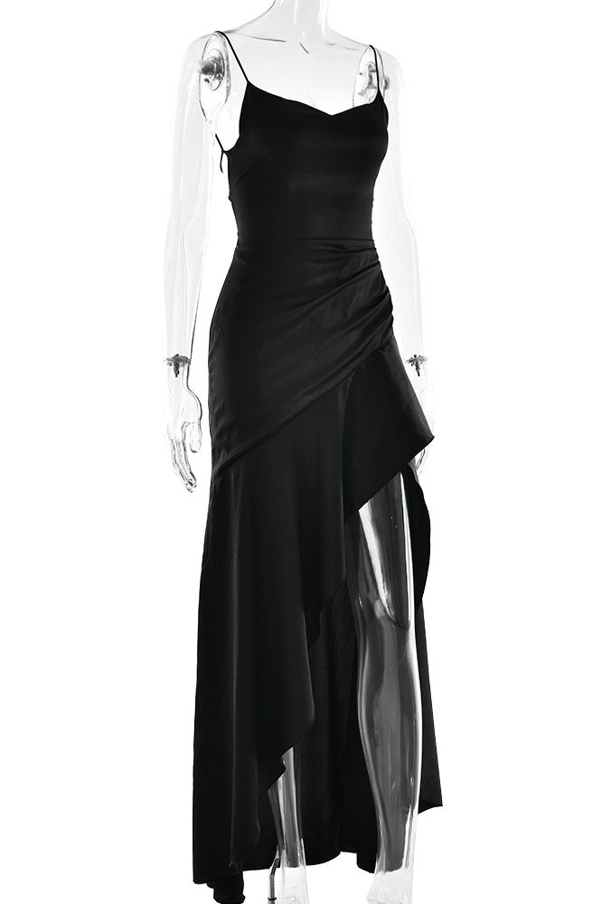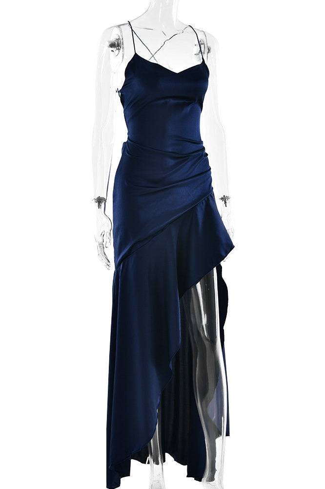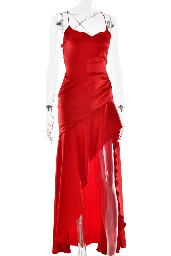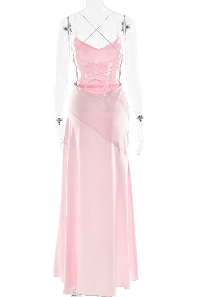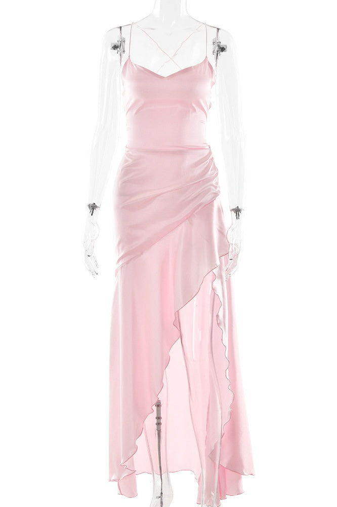 This maxi dress features a satin fabric in light pink with an A-line silhouette. It showcases an asymmetrical ruffled hem and spaghetti straps, complemented by a back tie detail. The shiny material highlights its high side slit and open back design, merging elegance with a modern edge.