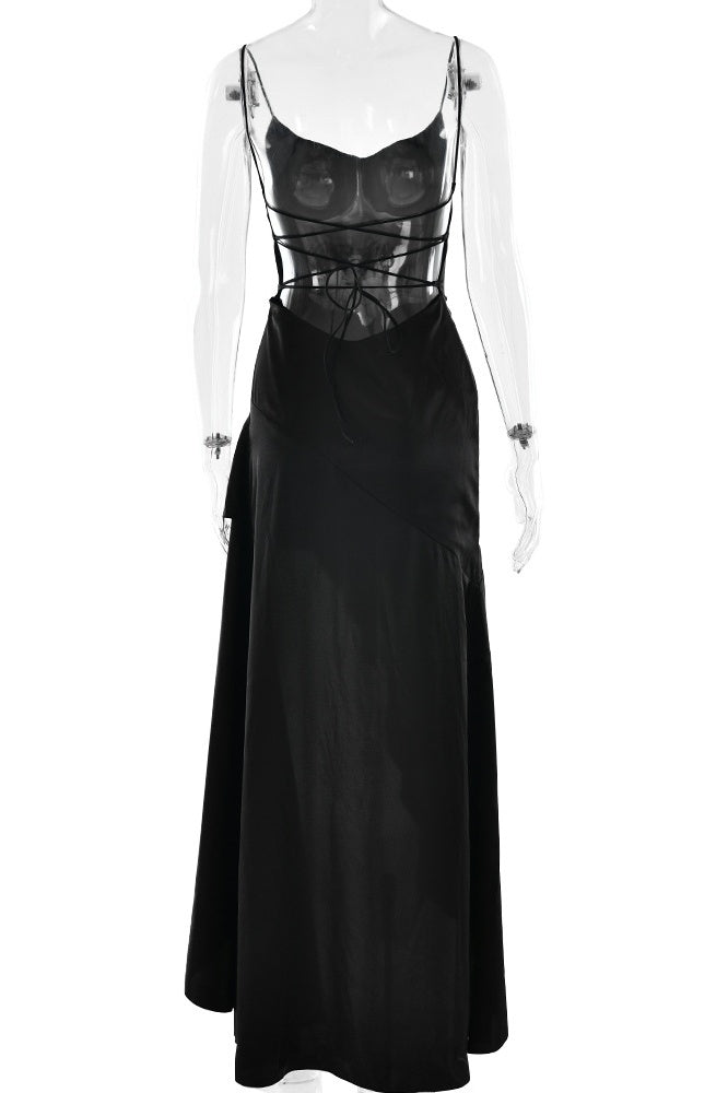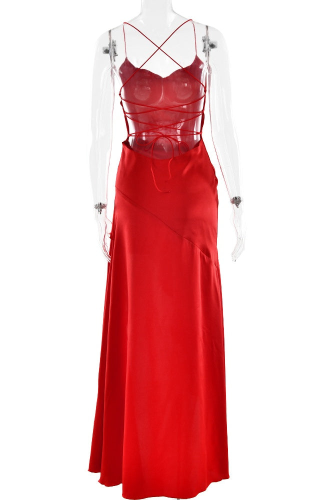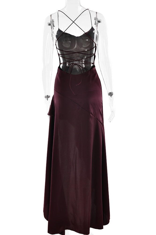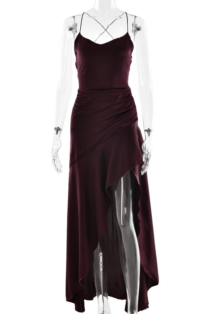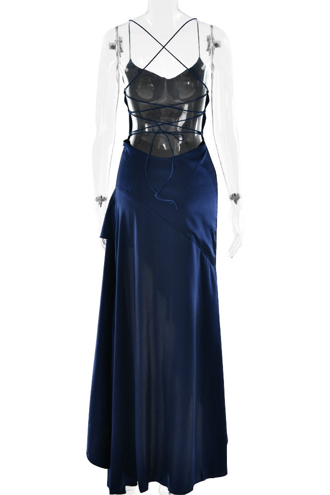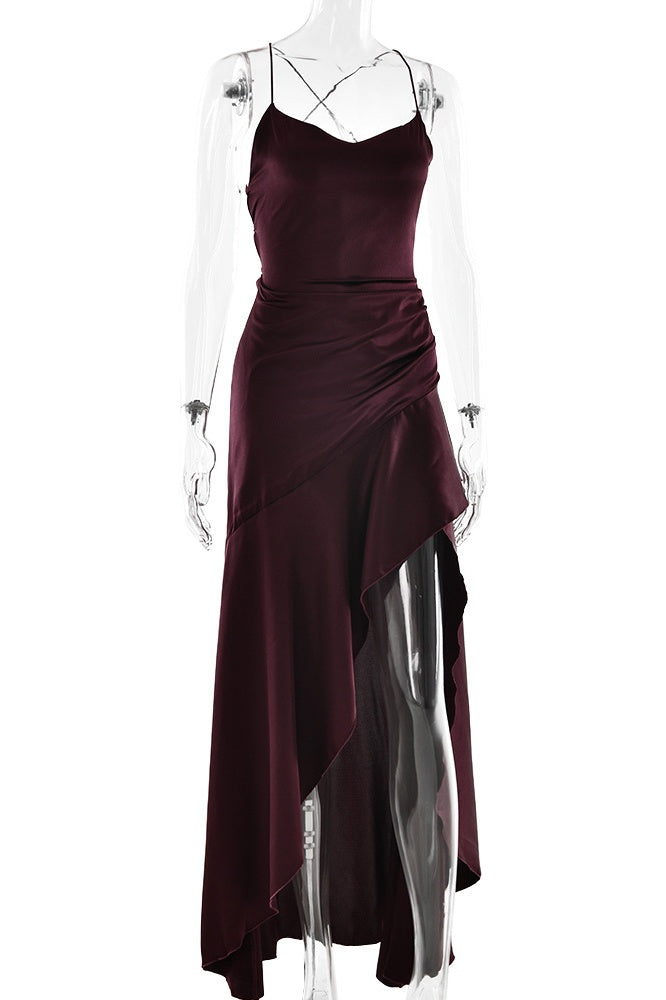 This maxi dress features a satin fabric in light pink with an A-line silhouette. It showcases an asymmetrical ruffled hem and spaghetti straps, complemented by a back tie detail. The shiny material highlights its high side slit and open back design, merging elegance with a modern edge.