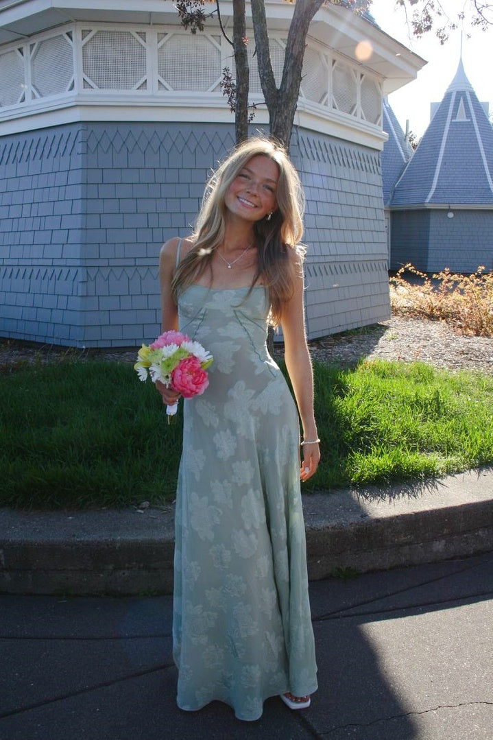 Spaghetti Straps Sage Floral Embroidery Long Dress