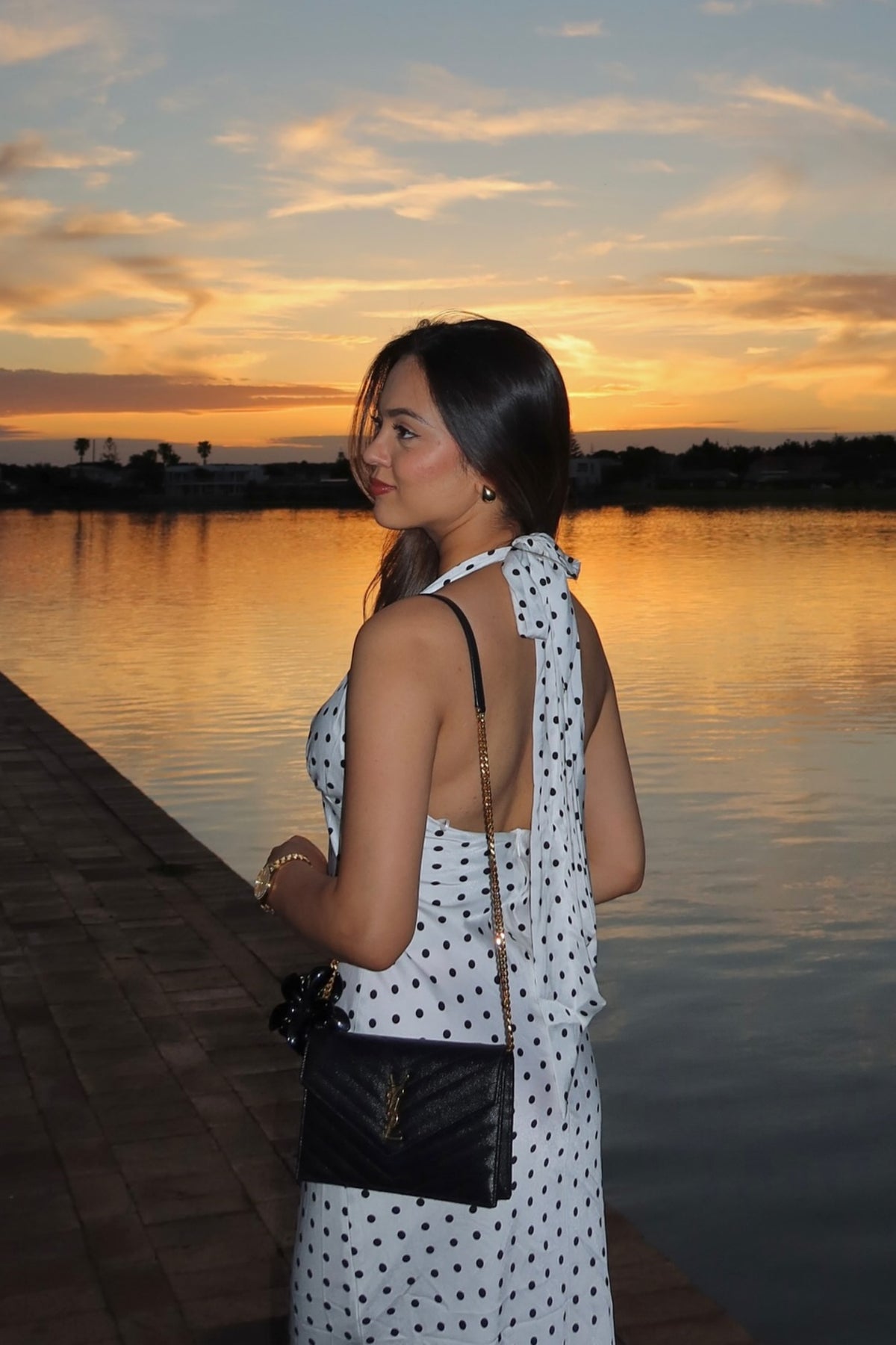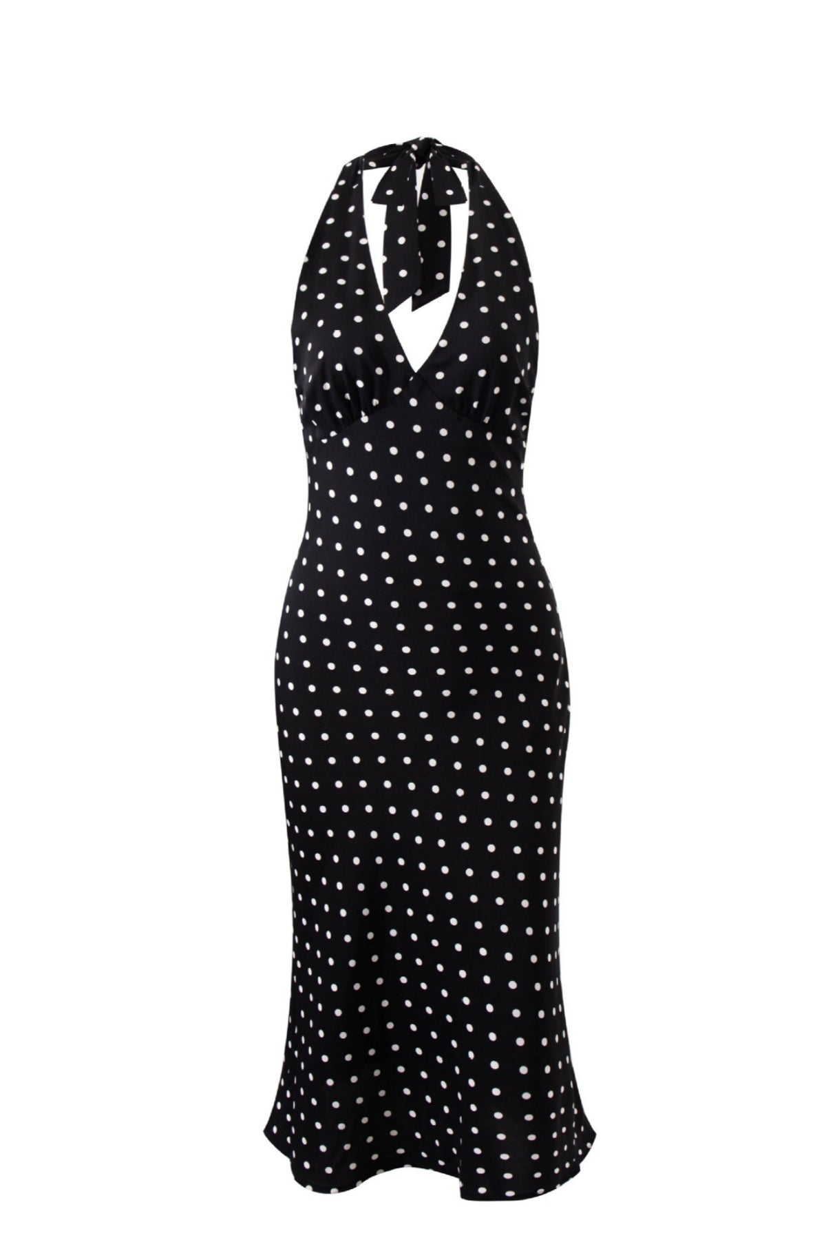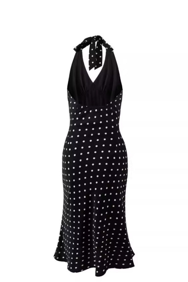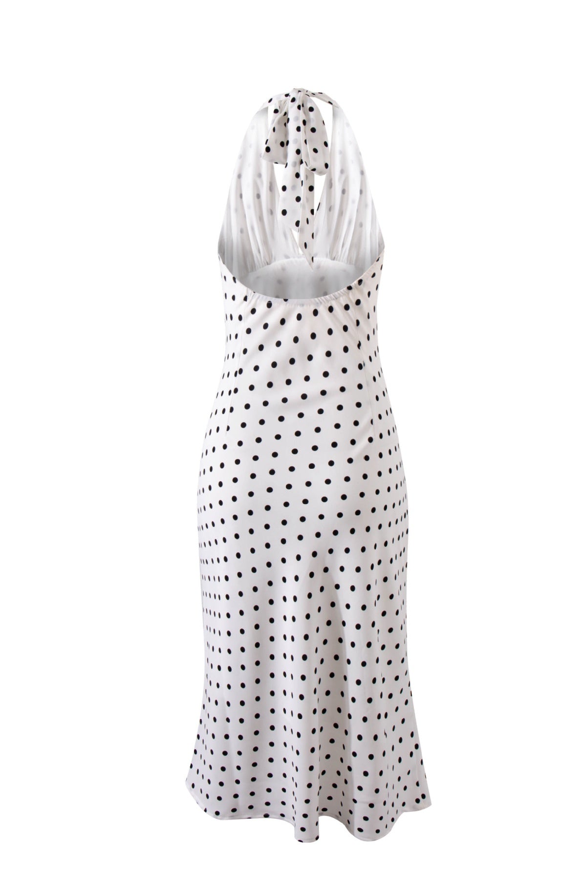 White halter dress with a flattering V-neckline and low back design. Crafted from polyester for durability, this slim-fit style features a side zipper and floor-length cut, perfect for elegant occasions.