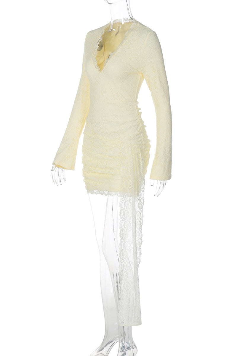 Yellow Lace Trim Ruched Mini Dress
