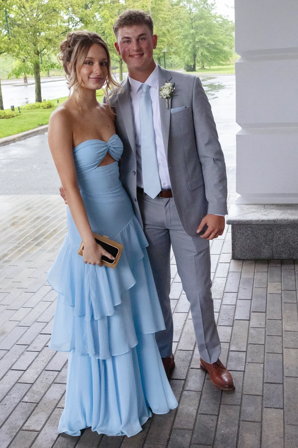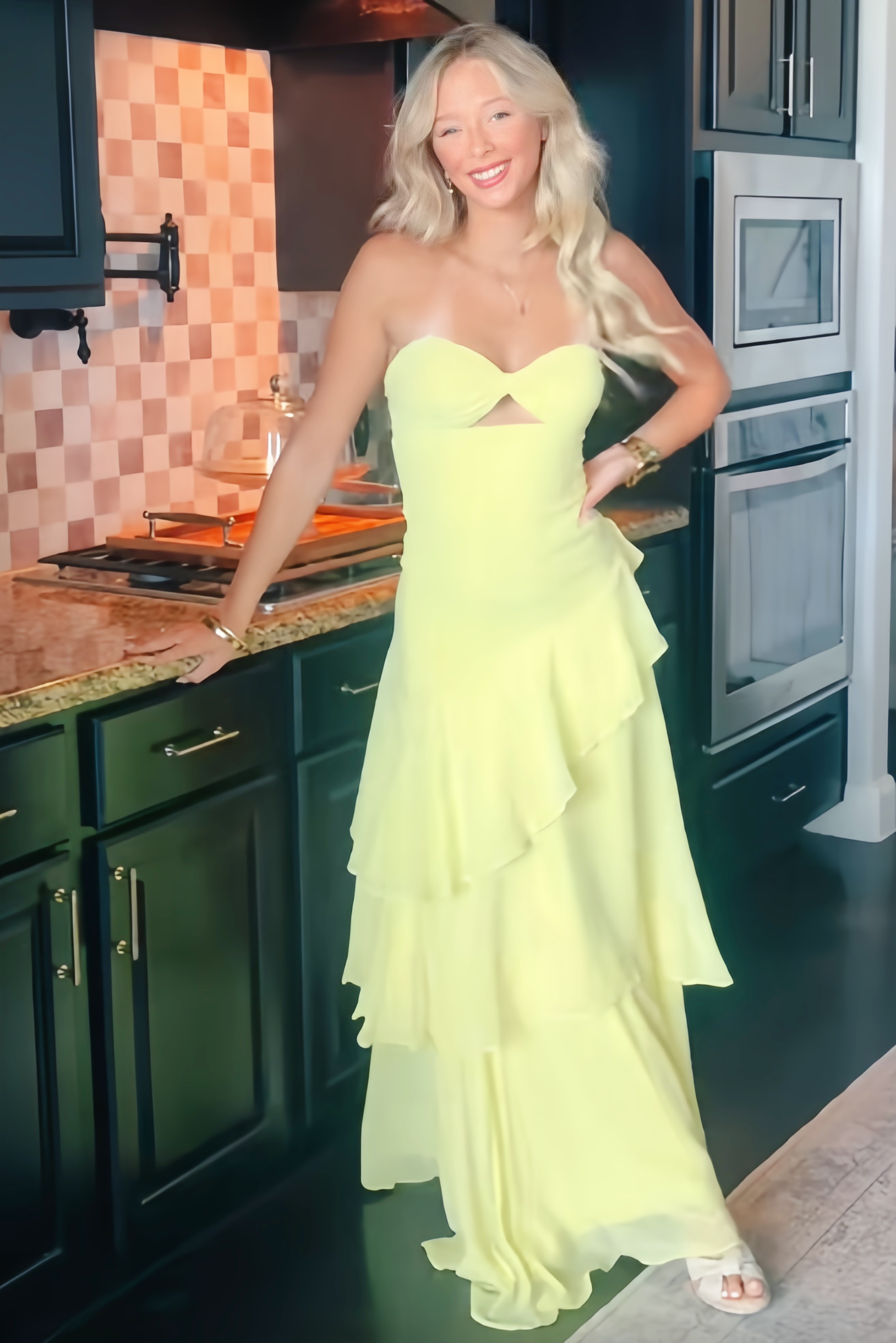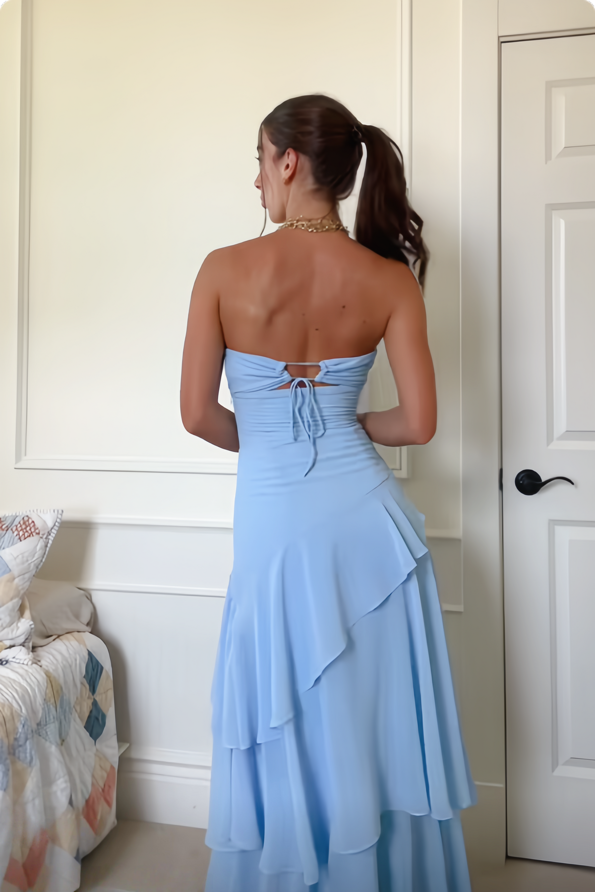 This elegant blue chiffon gown features a strapless A-line design with a sophisticated bust cut-out and textured ruffle hem. Secured by a lace-up back and side zipper, this full-length dress delivers refined style for special occasions.