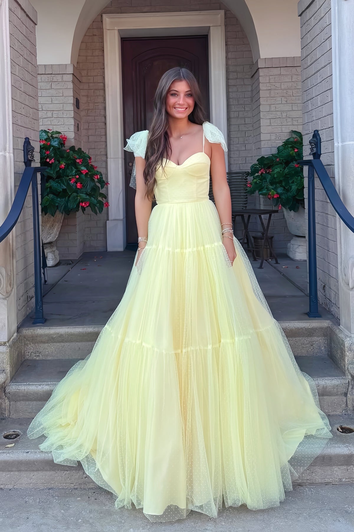 This Hot Pink Polk Dots A-line Long Formal Dress features a Tulle material with polka dots and a fitted bodice secured with straps tying off the shoulder. It is styled with an A-line silhouette with a zip-up back.