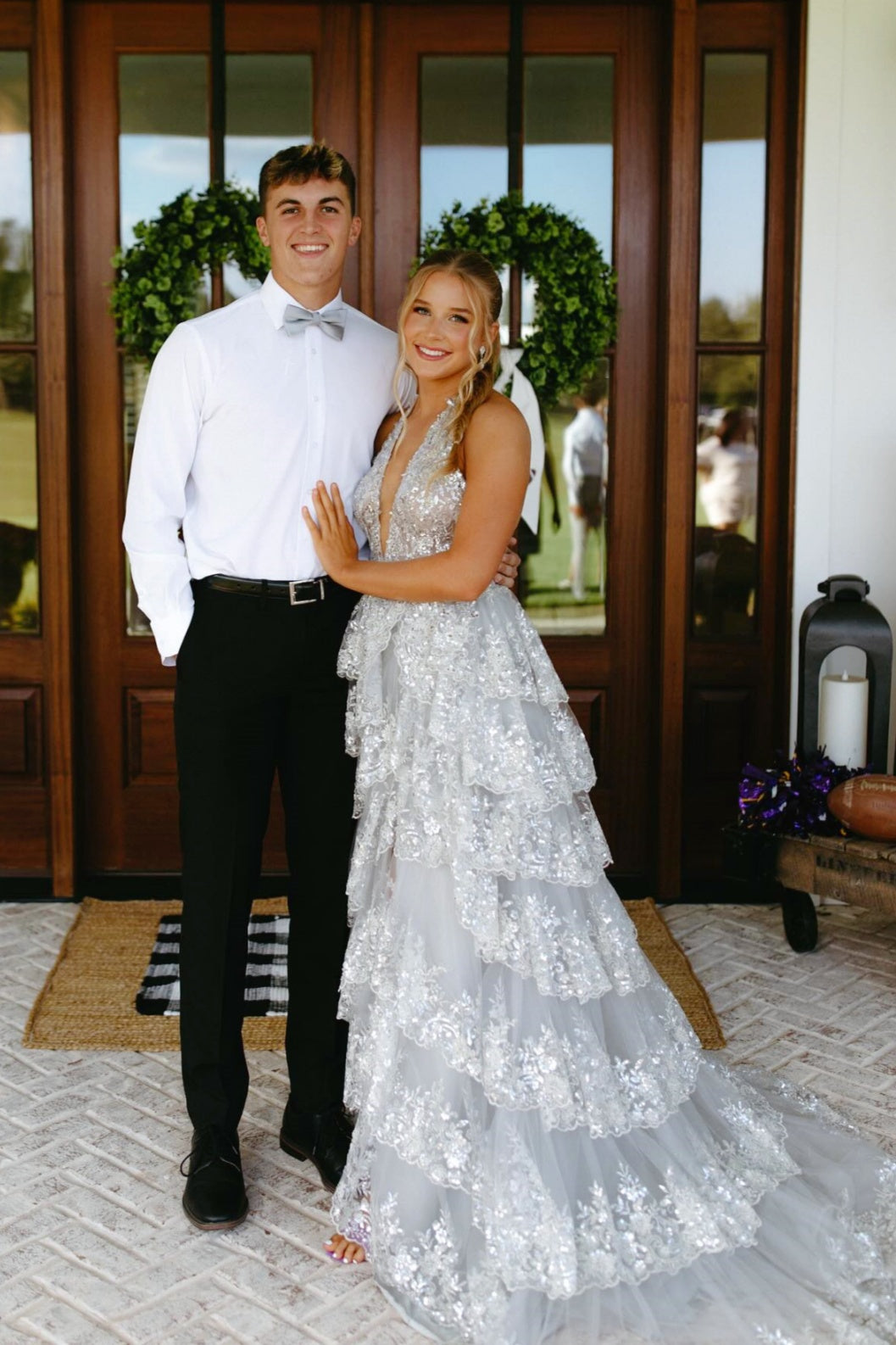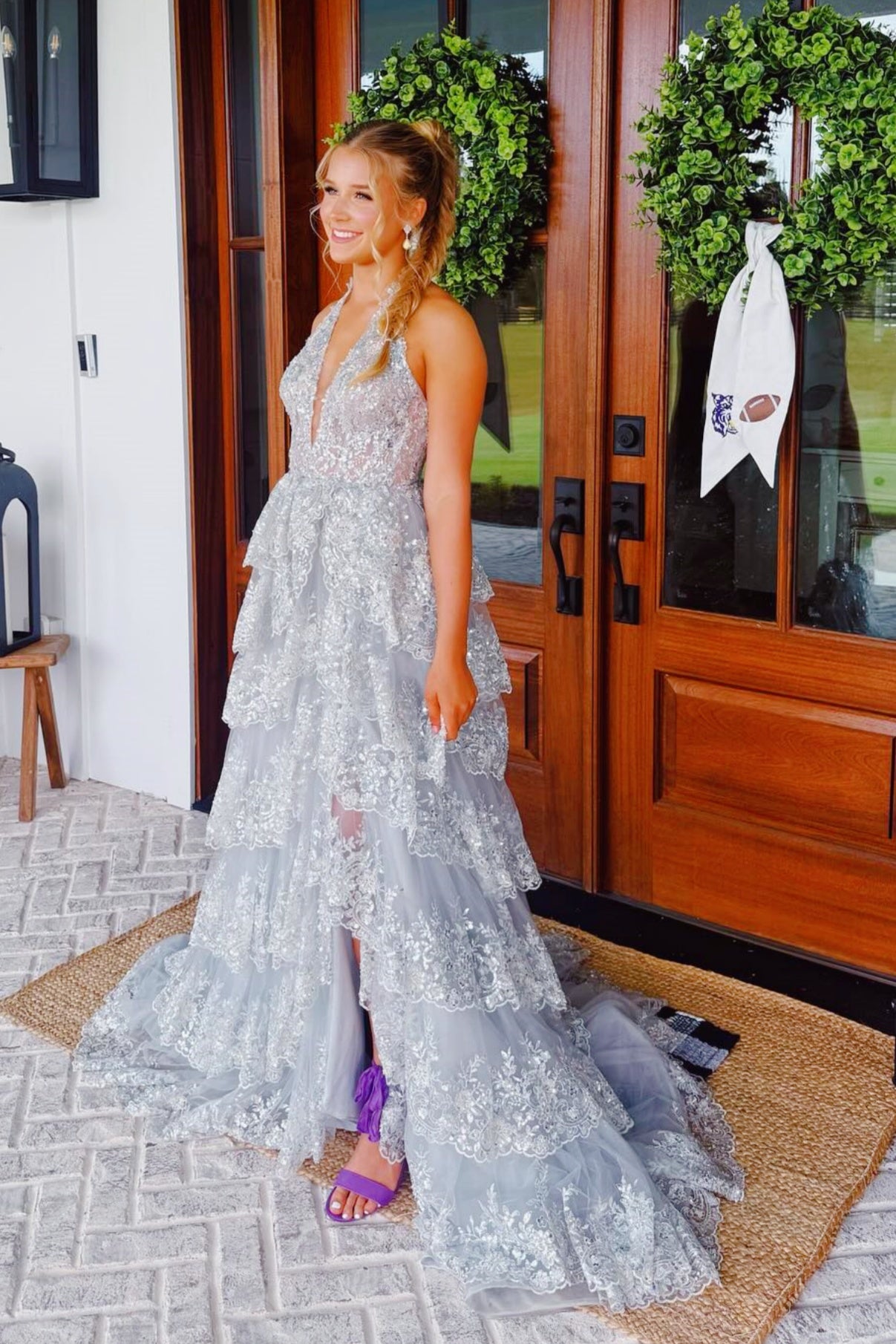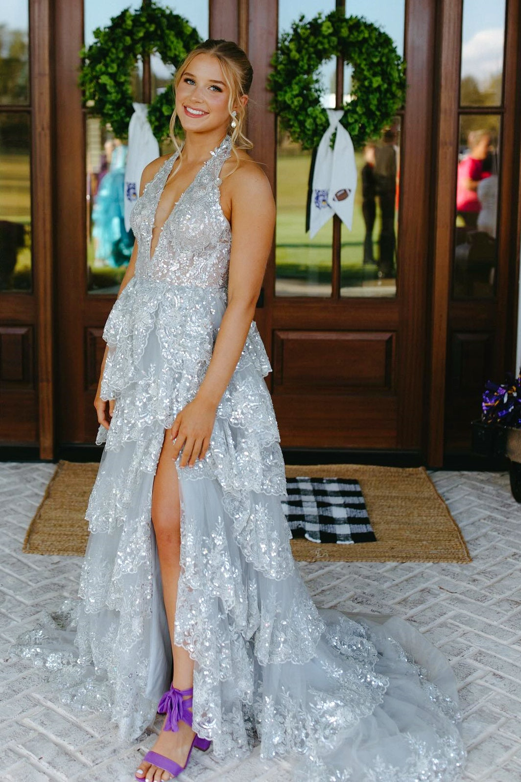 Light Gray Halter V-Neck A-Line Ruffled Prom Dress