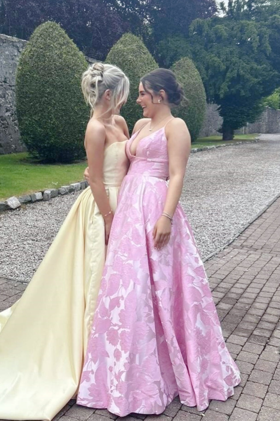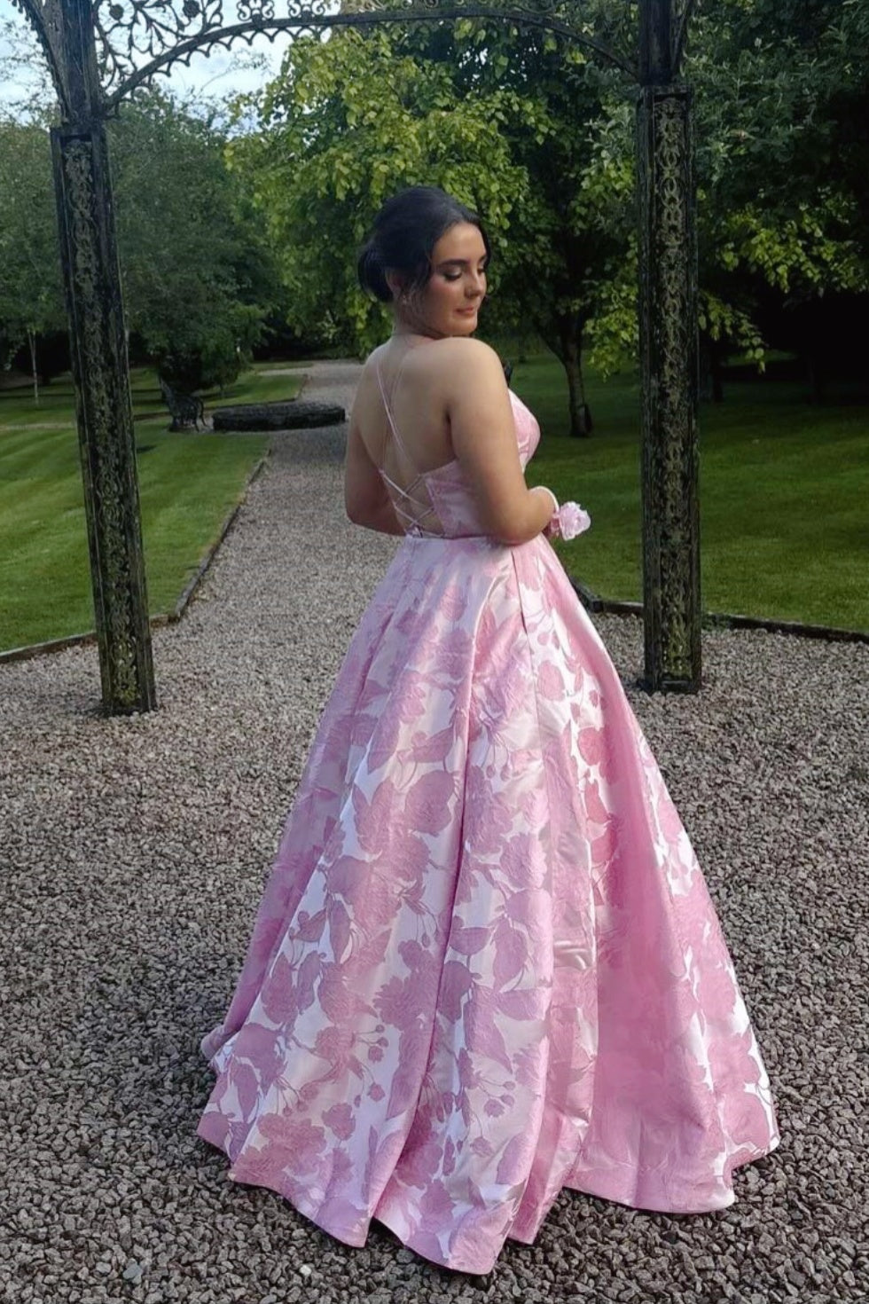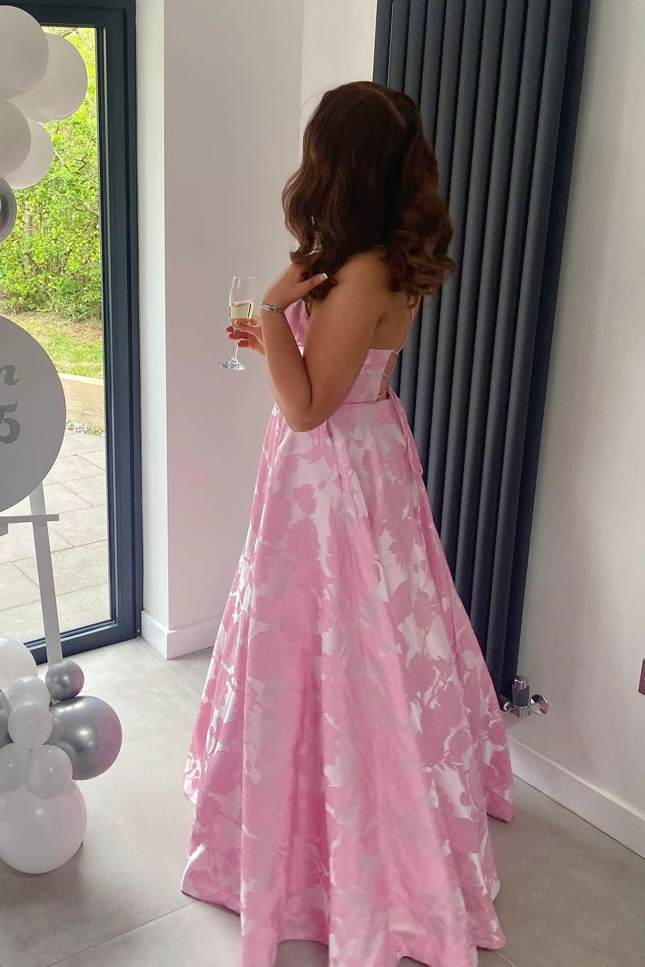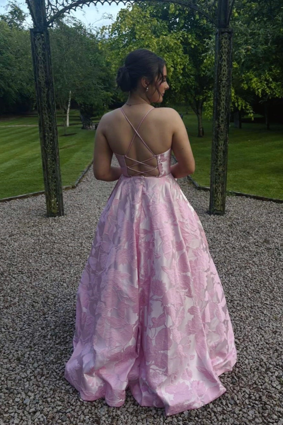 Pink satin jacquard A-line dress with spaghetti straps and a V-neckline. Features a ruffled hem, low back design, and lace-up closure for a refined silhouette.