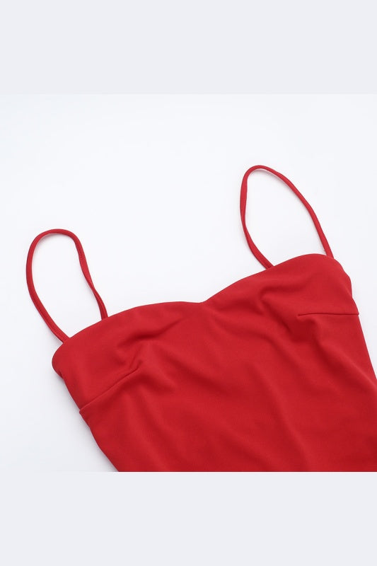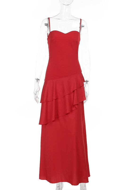 Red Spaghetti Strap A-Line Ruffled Long Dress