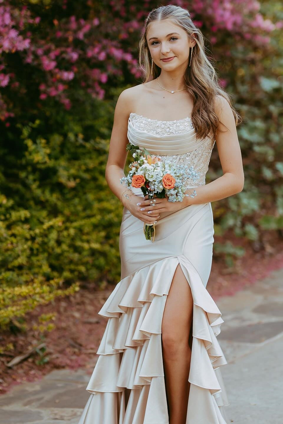 Constructed from satin material, this full length dress features a strapless neckline, mermaid silhouette, and ruffle design with a side slit.