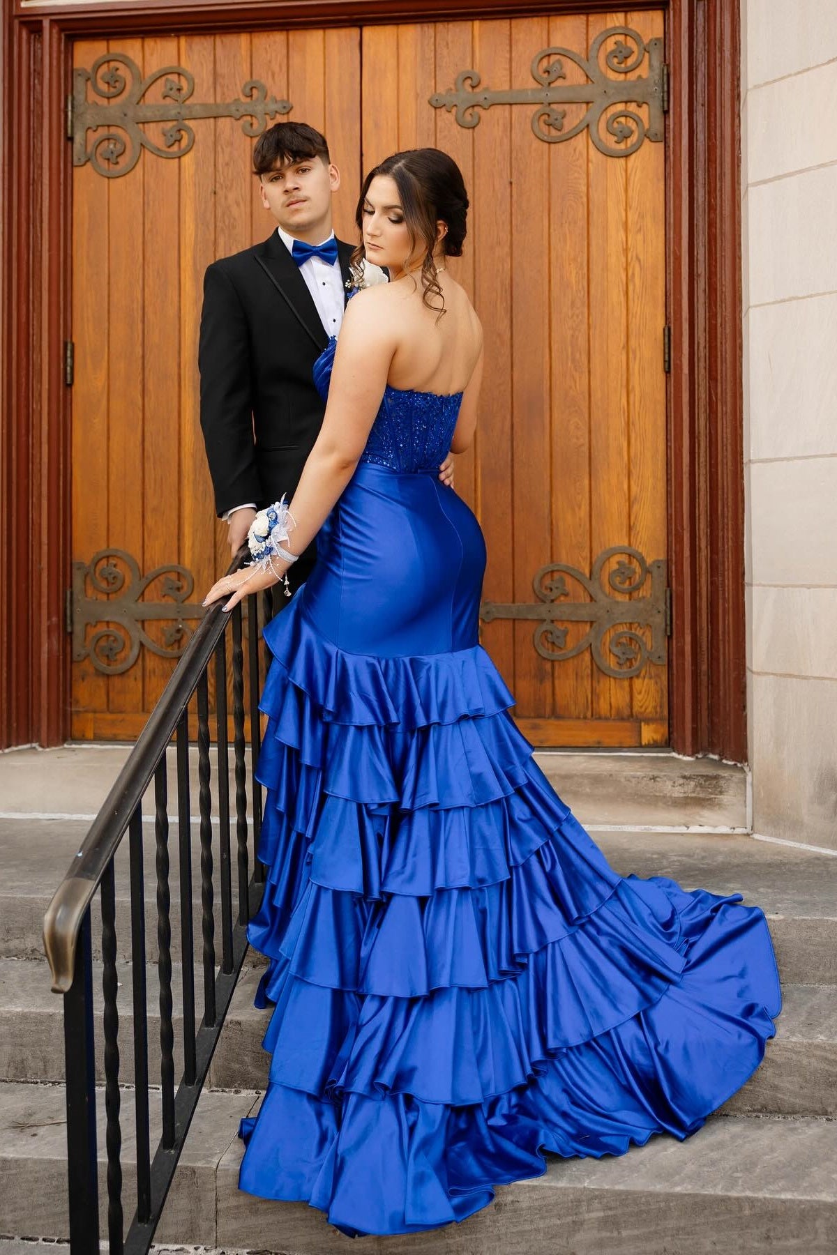 Royal Blue Mermaid Strapless Appliques Ruffle Prom Dress with Slit