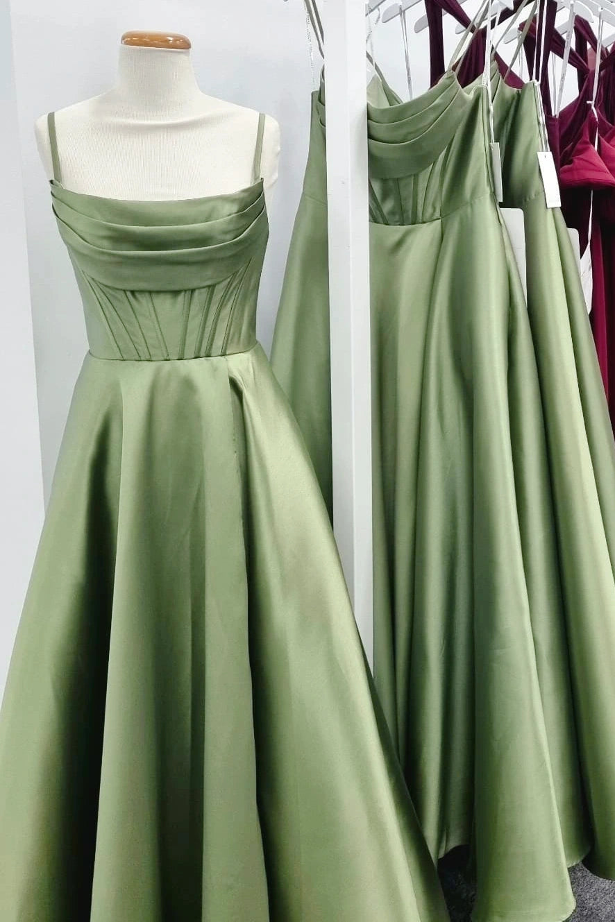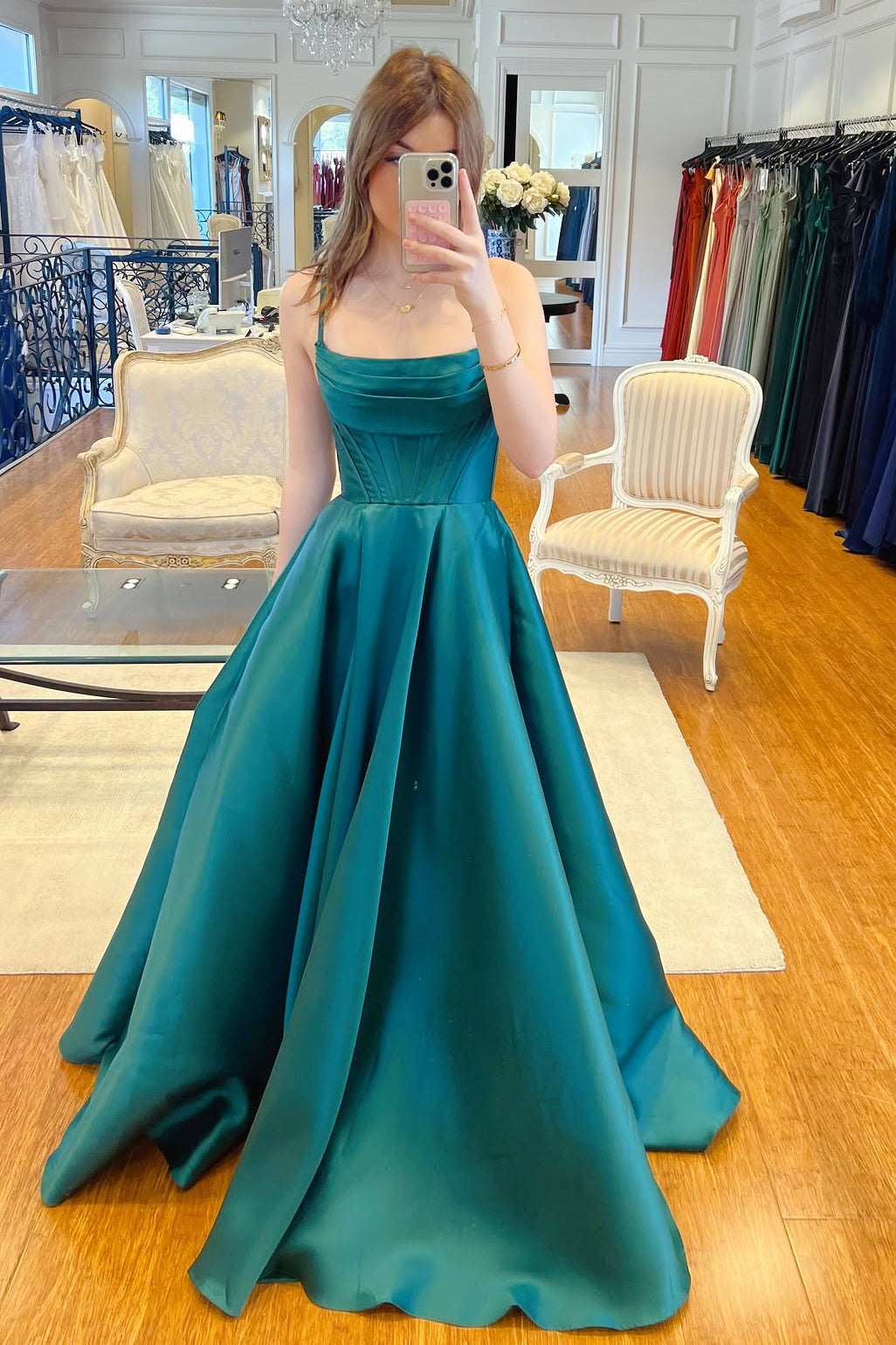 Light blue A-line prom dress in satin with delicate spaghetti straps and structured corset bodice. Floor-length flared skirt provides graceful movement, while the back zipper ensures a polished finish for any formal occasion.