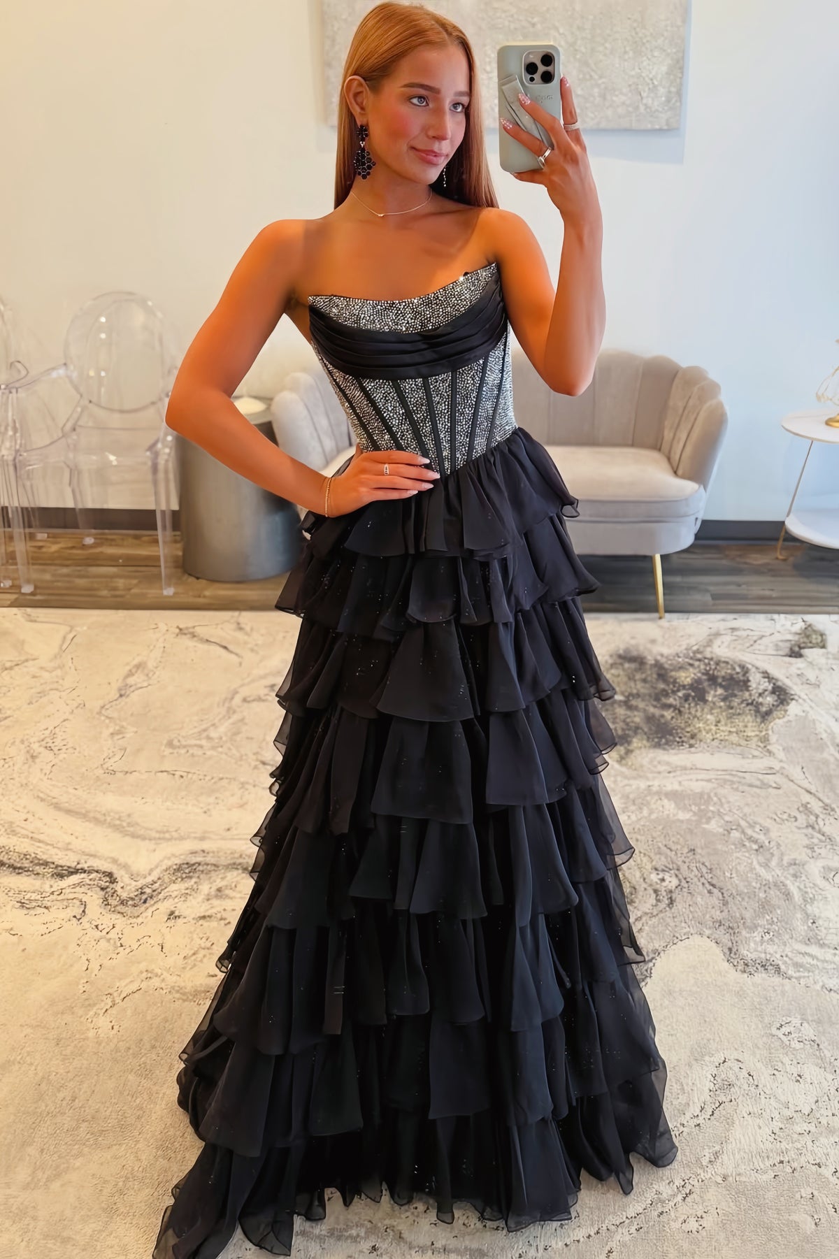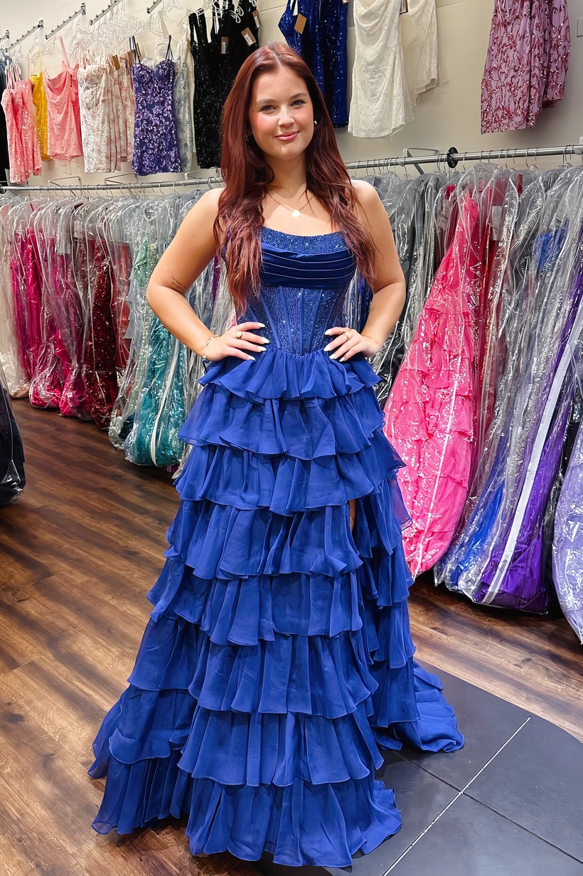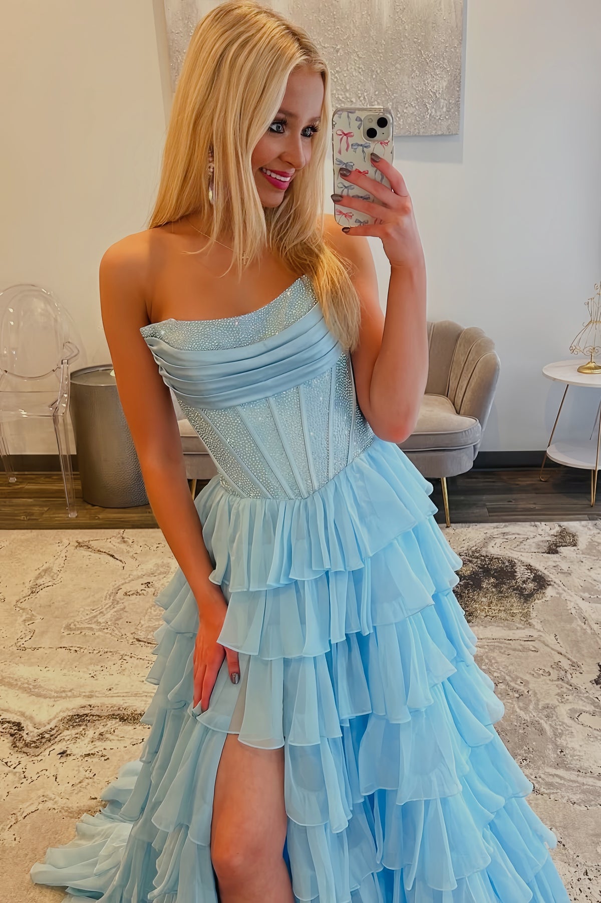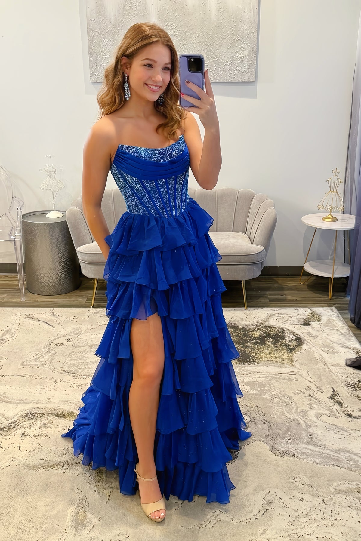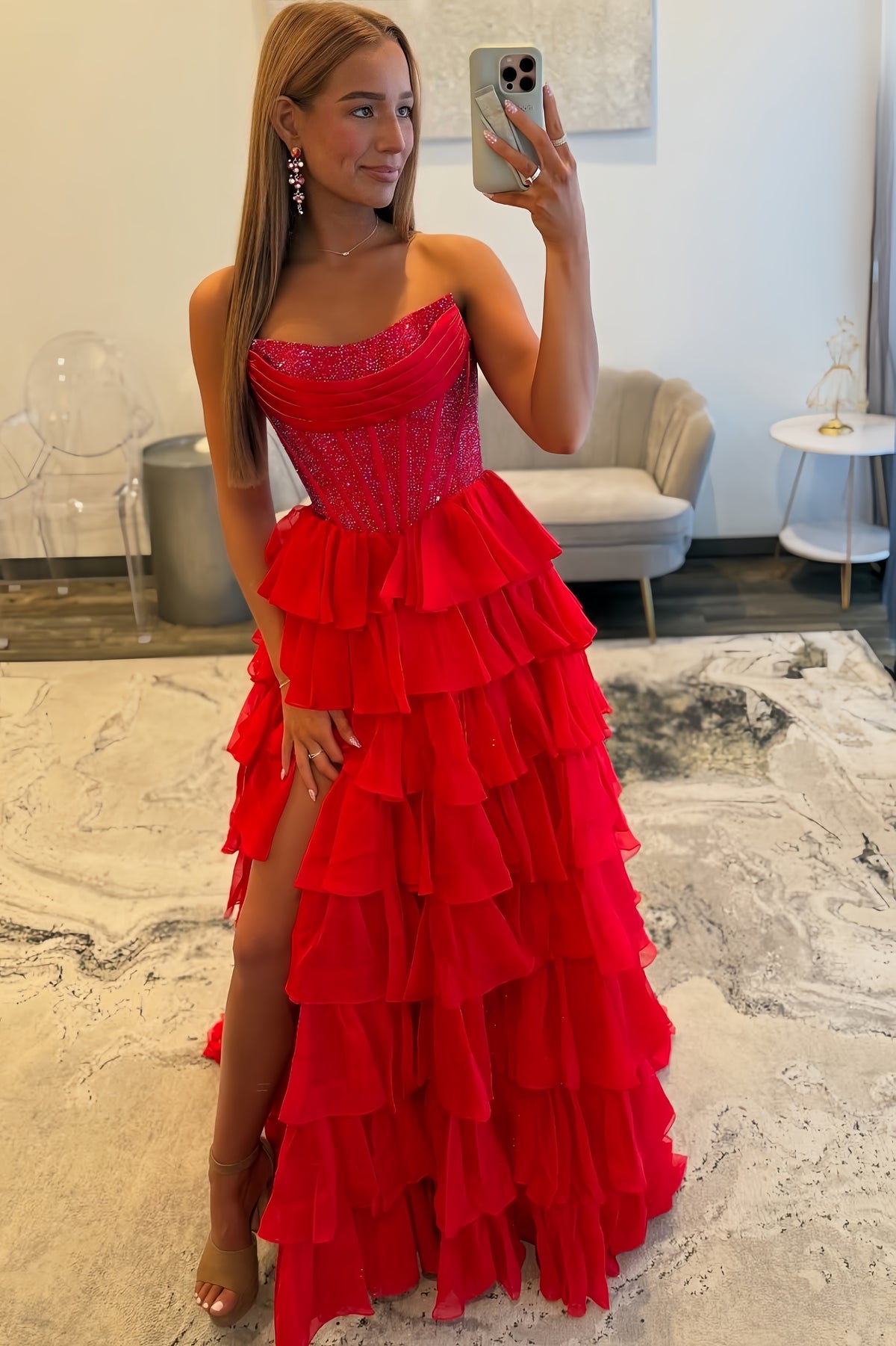 This stunning prom dress features a Strapless A-line design with a cascading ruffle silhouette and a full-length hemline. Made of high-quality chiffon material, it boasts a lace-up back and a side slit for added style and comfort. The chest is adorned with sparkling sequins while the ruched detailing adds texture to the overall look.