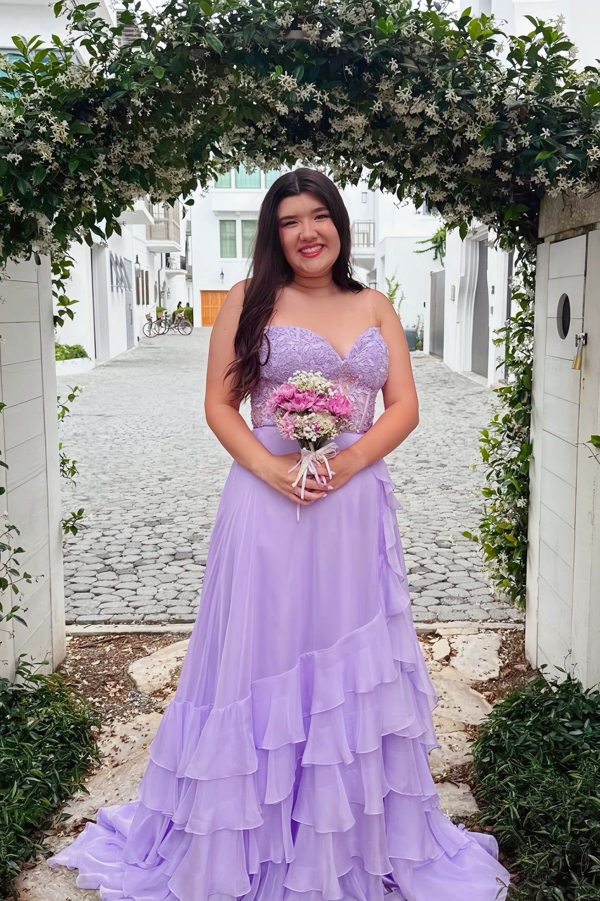 Sweetheart Yellow Lace Appliques Chiffon Ruffle Prom Dress