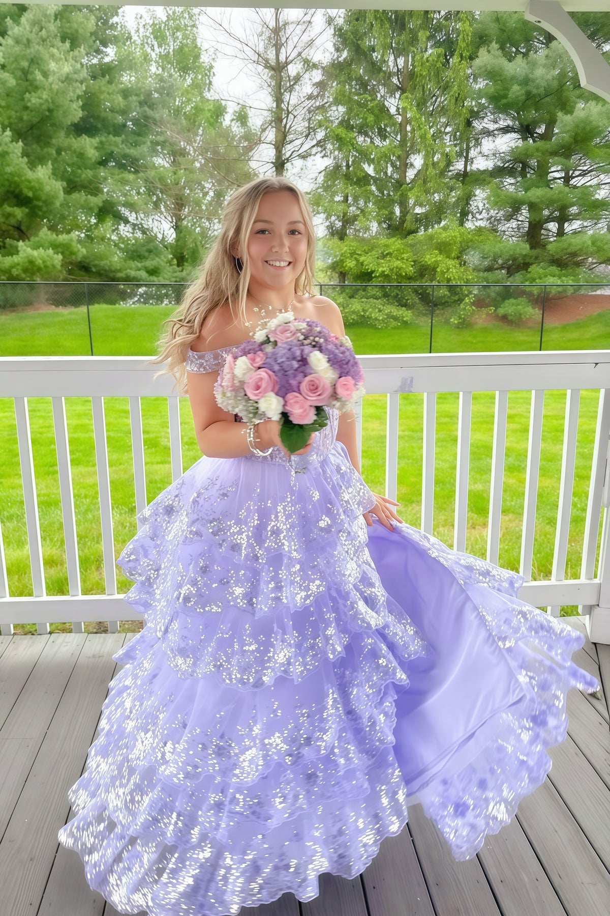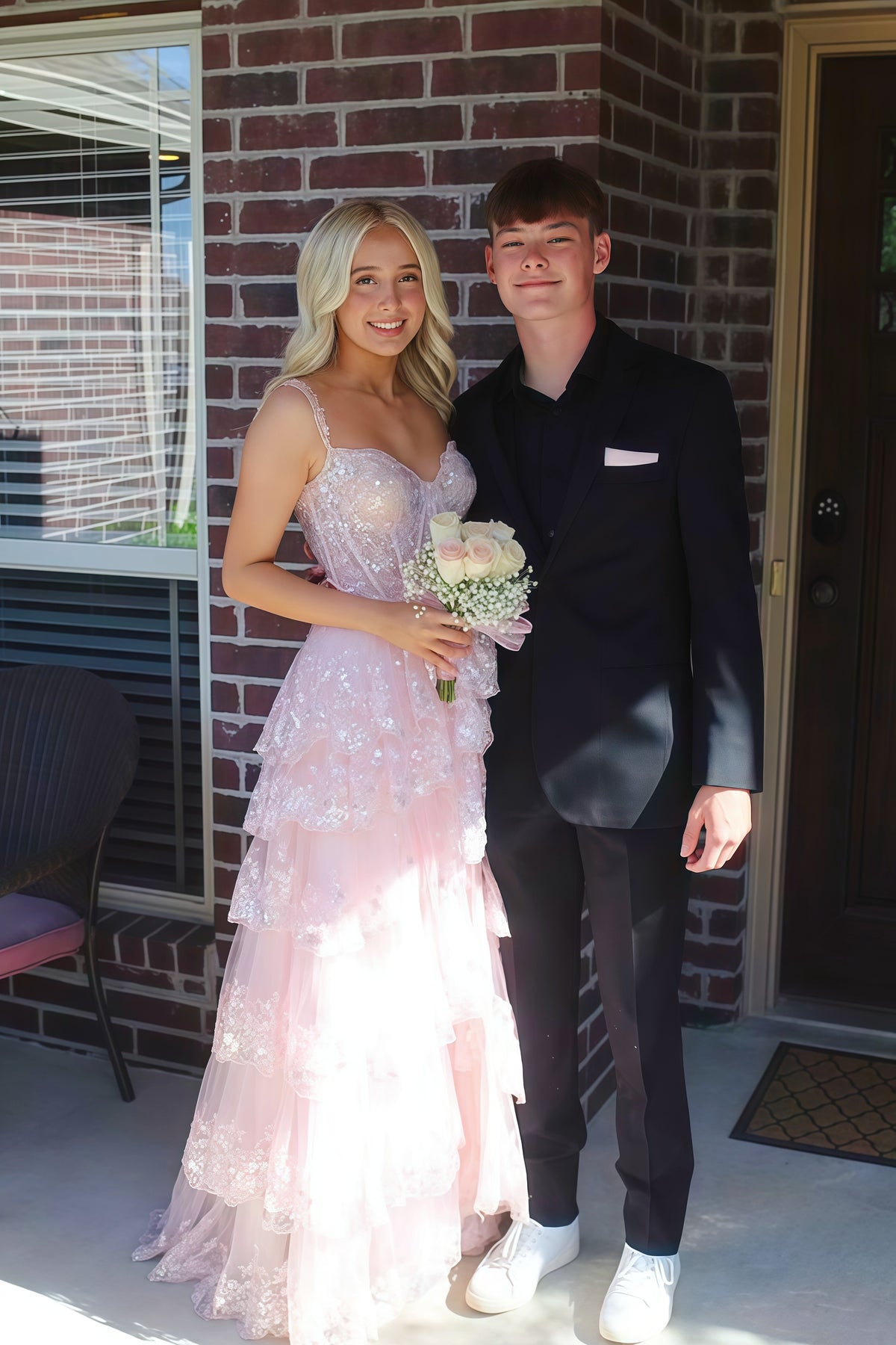 Corset Tulle Appliques Tiered Ruffle Long Prom Dress with Slit
