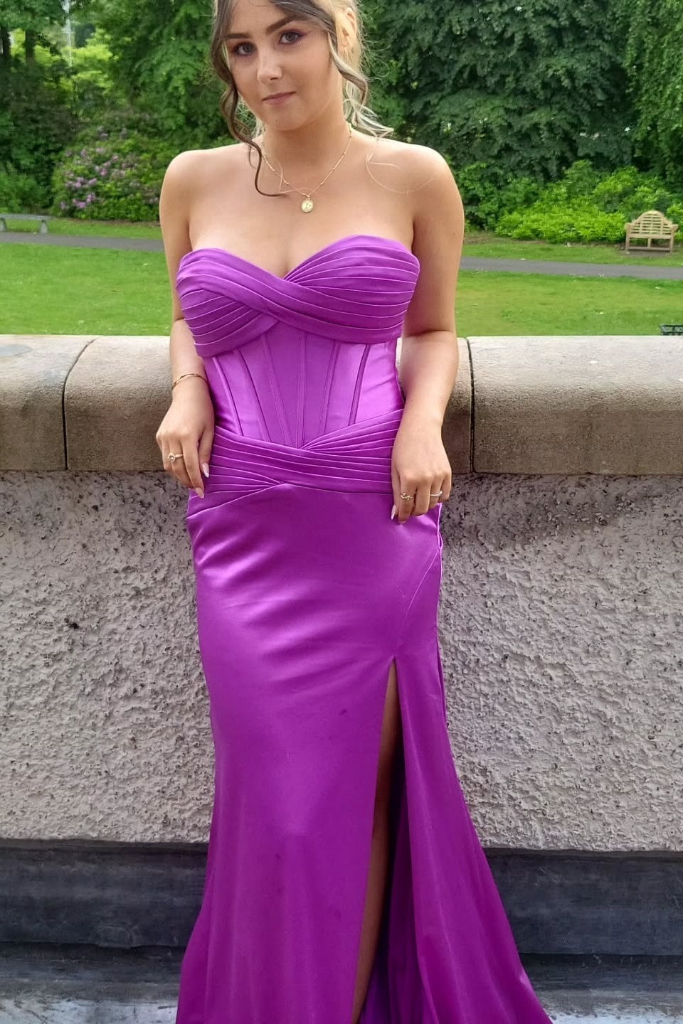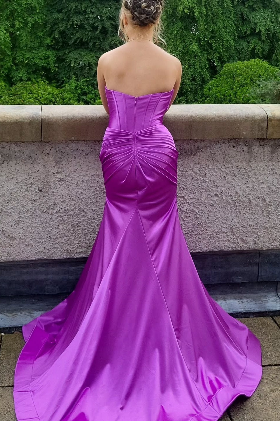 Crafted from luxurious satin, this striking mermaid gown features a sweetheart neckline and a structured corset bodice that flatters the figure. The elegant silhouette flows into a graceful full-length skirt with a subtle side slit and short train for refined movement. Finished with a secure zip-up back closure, this formal dress combines timeless sophistication with contemporary design details, making it an exceptional choice for upscale evening events.