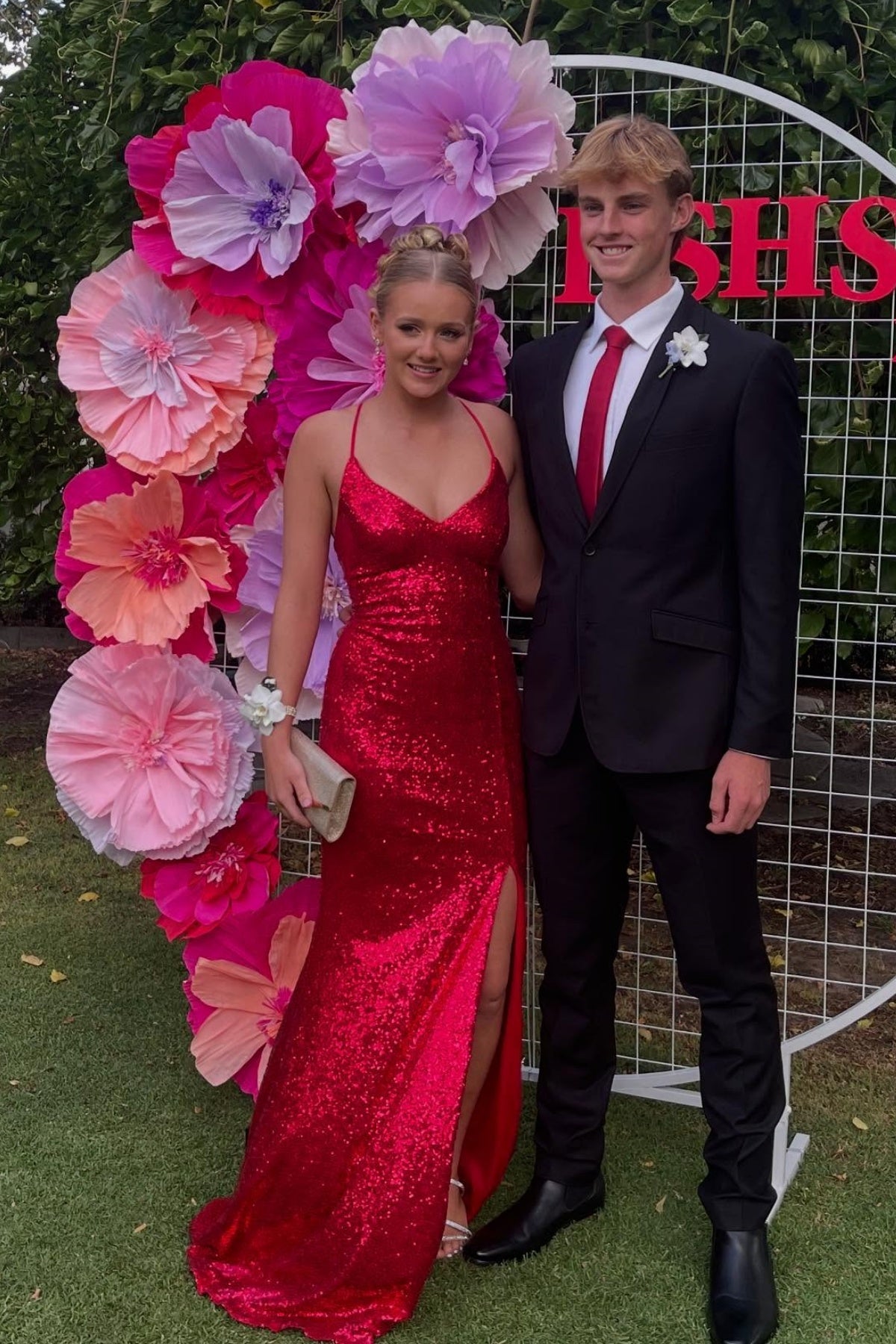 This stunning sequin gown in rich red captivates with its sleek slim-fit silhouette and plunging V-neckline, complemented by delicate spaghetti straps and halter support. The strategic side slit allows for elegant movement, while the open back with tie fastening creates an understated yet alluring detail. Enhanced by a subtle train and floor-length proportions, this dress delivers sophisticated sparkle and refined glamour for memorable evening events.