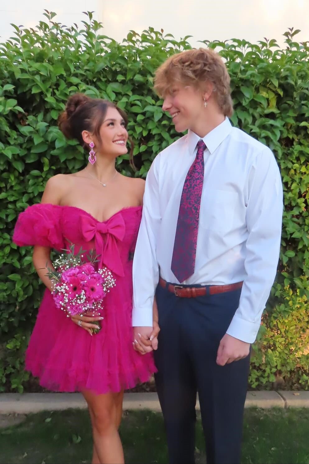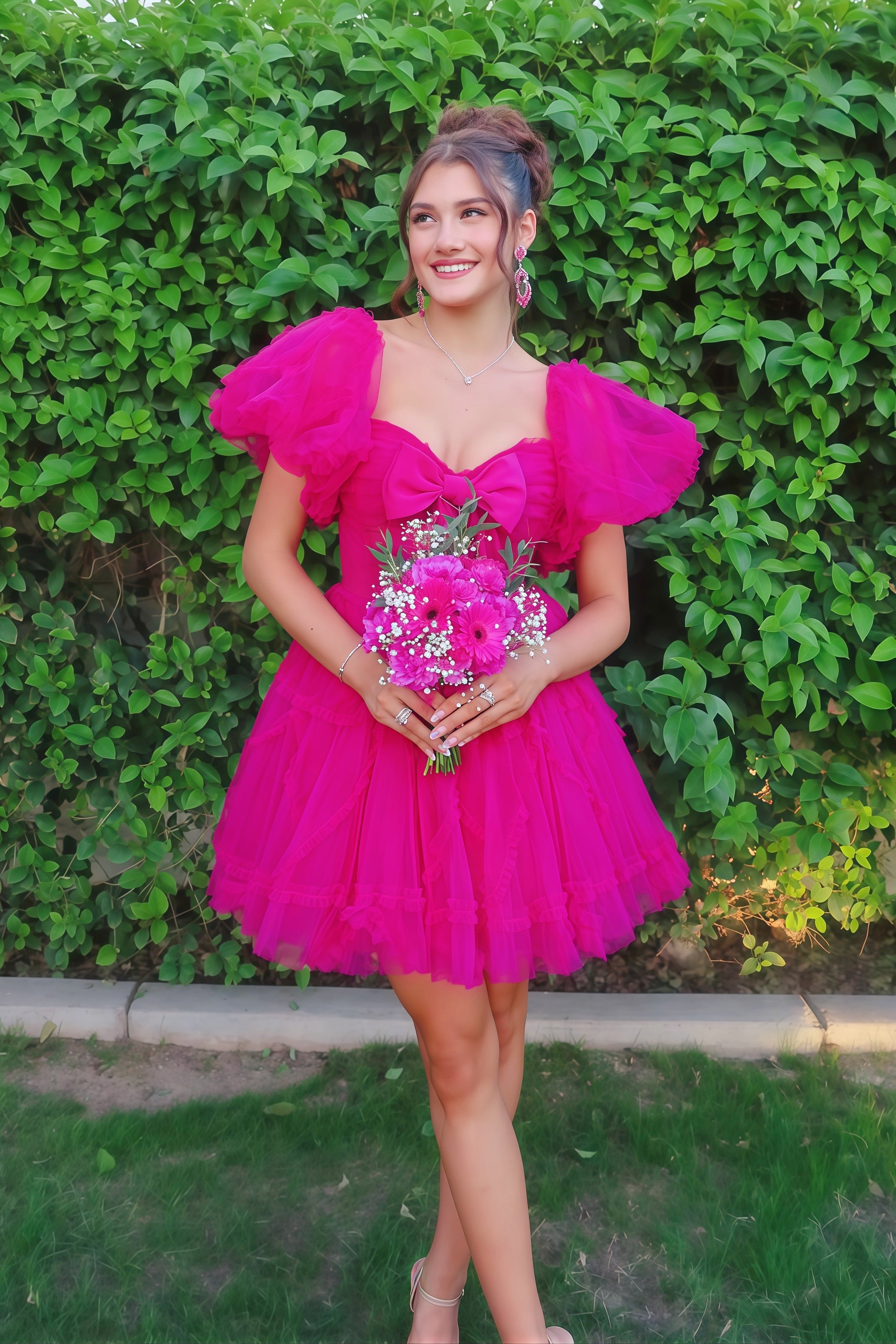This elegant A-line dress features a flowing chiffon construction designed to flatter and move gracefully. The puff sleeves add a romantic touch, while the bow embellishment and ruffled hem create visual interest at the neckline and hemline. Cut to an above-knee length with a flattering low back, this piece combines classic silhouette with contemporary details, making it an ideal choice for cocktail events and semi-formal occasions.