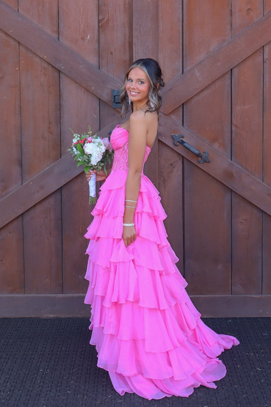 This full-length gown in teal blue chiffon showcases an A-line silhouette with a sweetheart neckline. Featuring a strapless design, side slit, tiered ruffle hem, and a low back, it offers an elegant and graceful appearance.