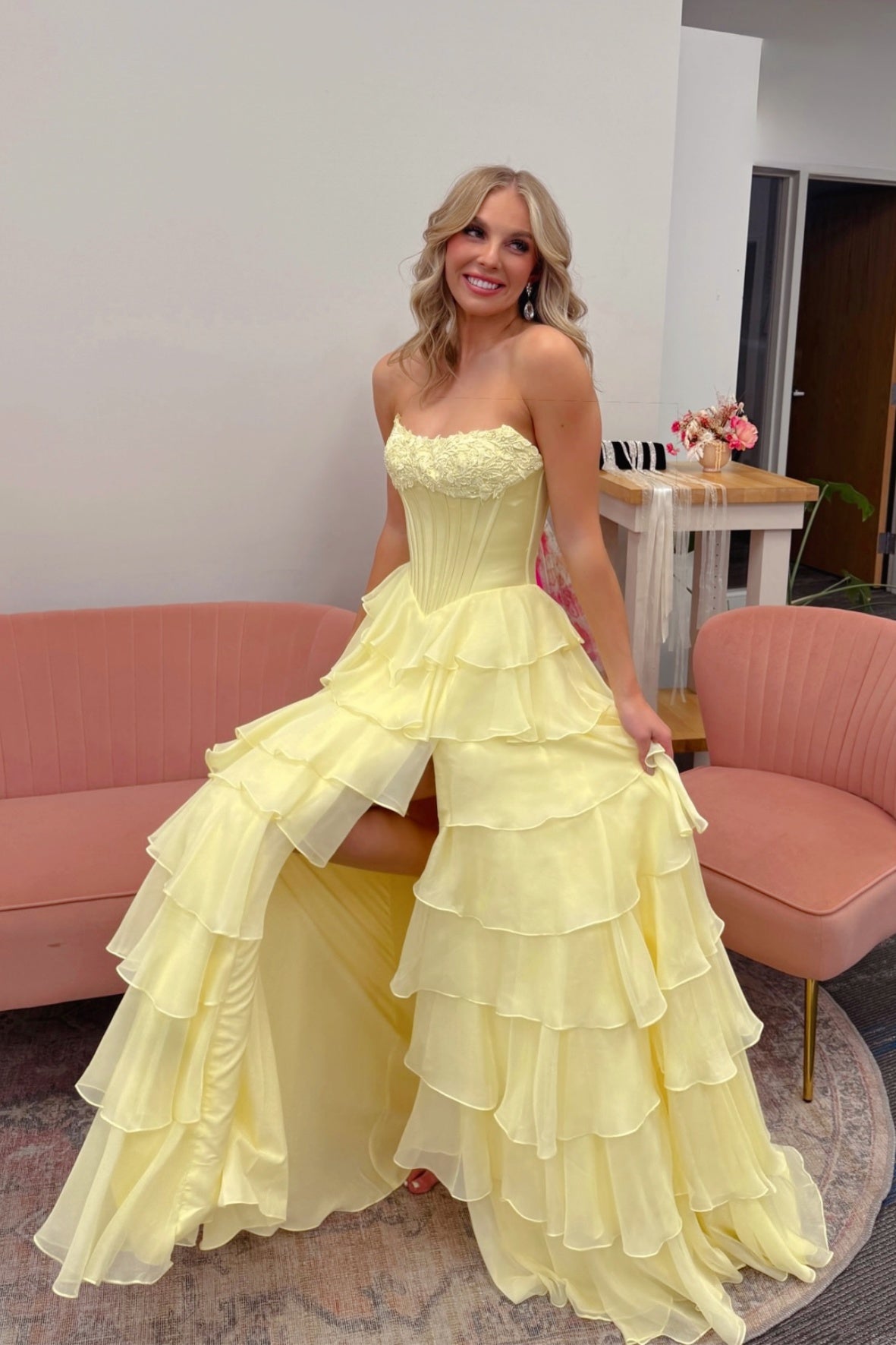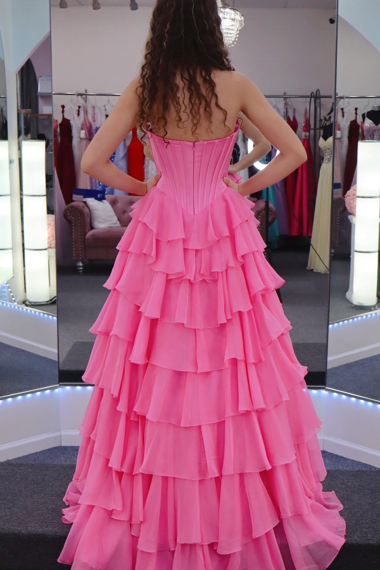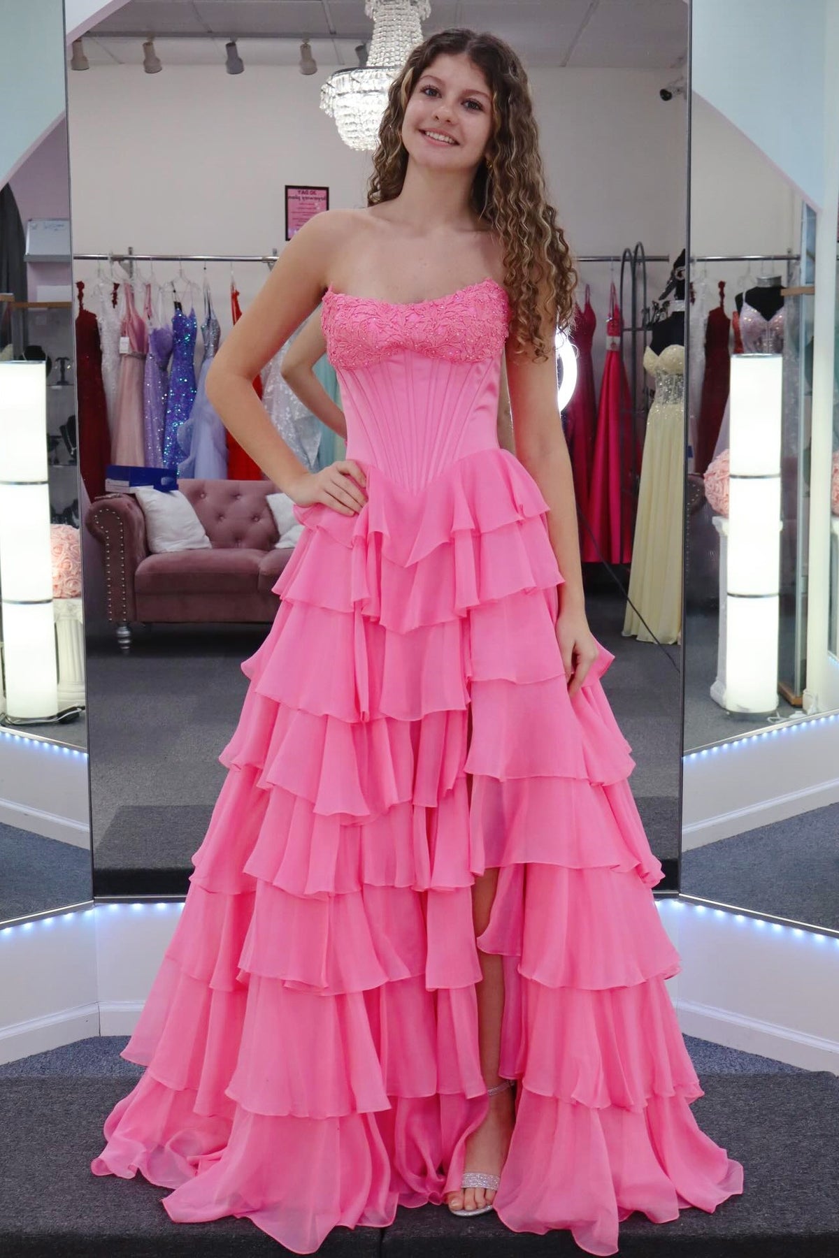 This full-length strapless dress features a classic A-line silhouette crafted from chiffon in a vibrant red hue. It showcases a tiered ruffle hem and delicate bead embellishments, complemented by a sophisticated low back design.