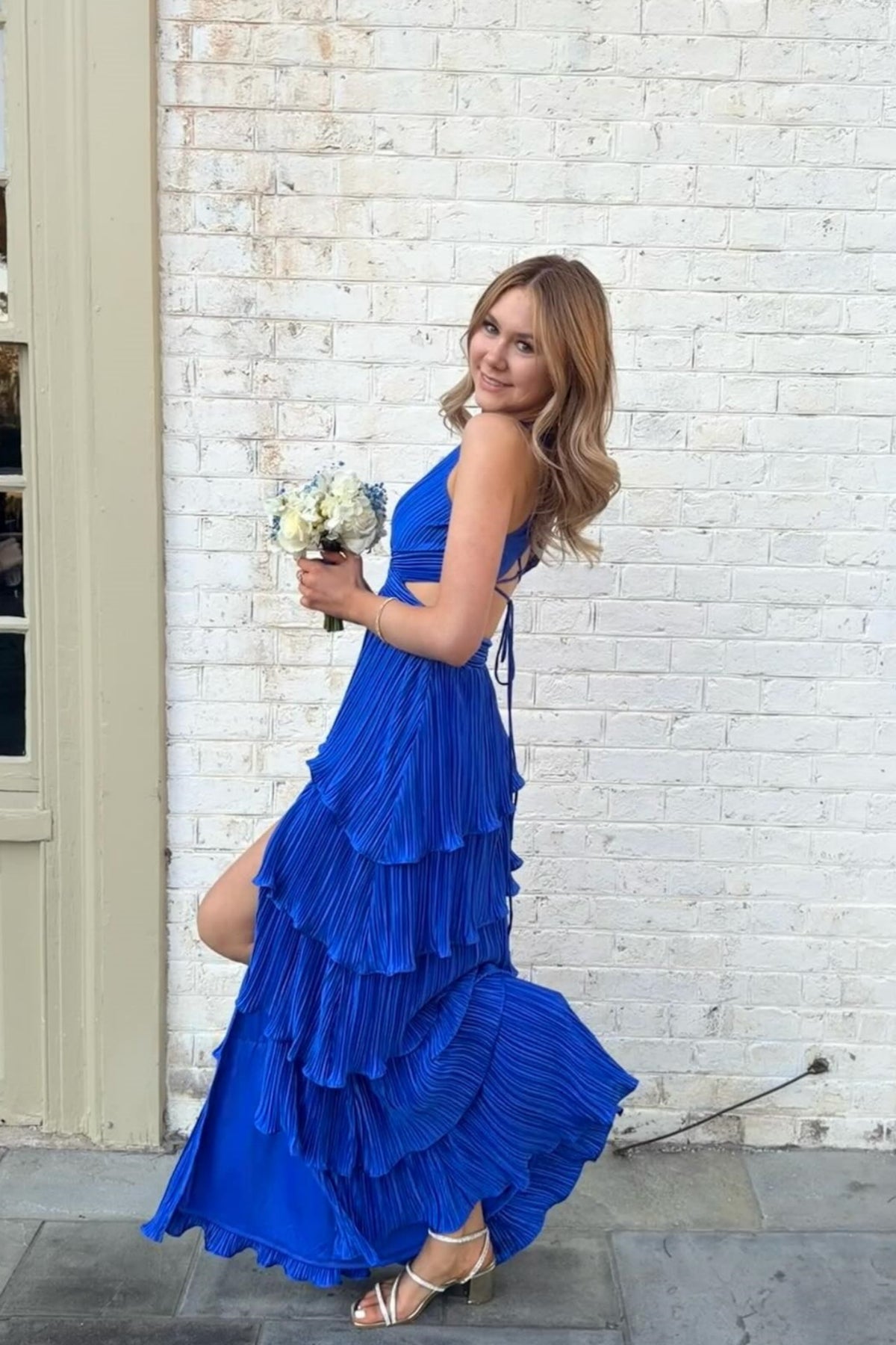 This long, full-length dress features a flattering A-line silhouette in royal blue polyester. It has a halter V-neck, a tiered skirt with a side slit, and a stylish lace-up cutout back.