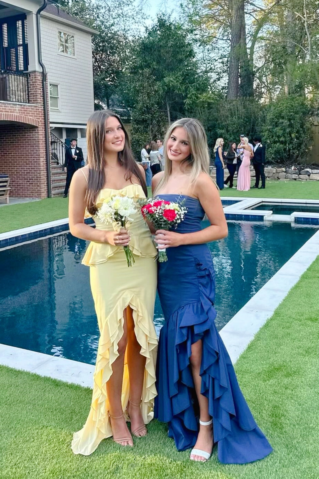 Straps Blue Chiffon Ruffle Slit Fitted Dress