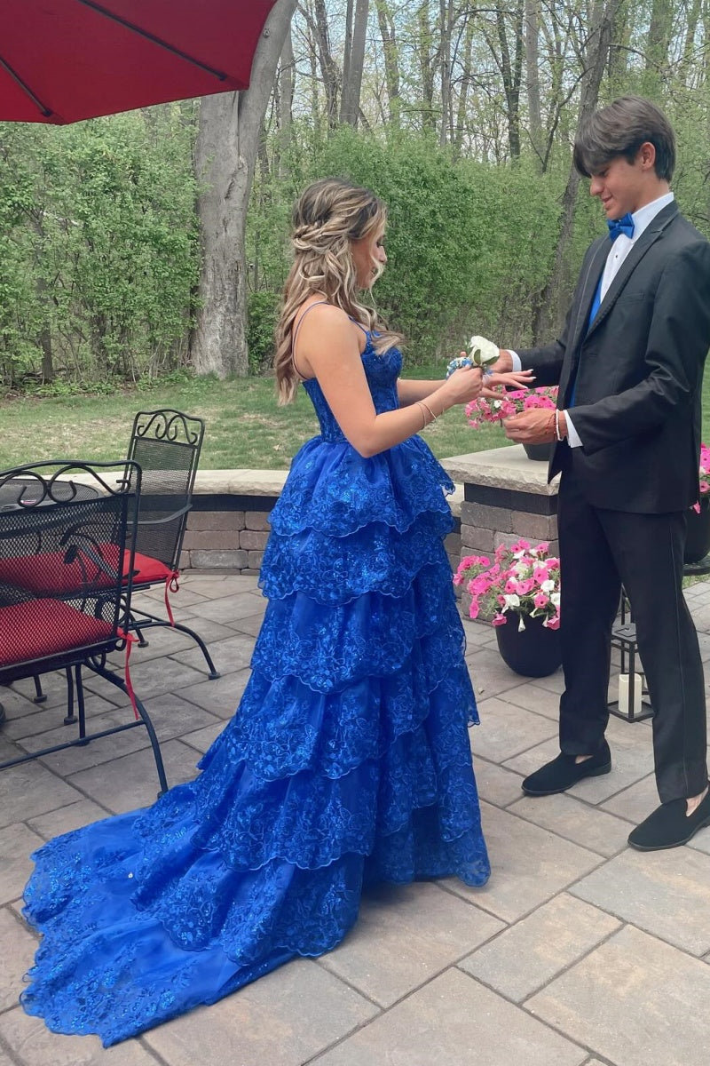 This dress features a navy blue Tulle material adorned with delicate sequin appliques, creating an elegant and stylish A-line silhouette. The corset bodice is sheer and held up by spaghetti straps, while the full length skirt is adorned with tiered ruffles for a captivating look. The dress is finished with a zip-up back for easy wear.