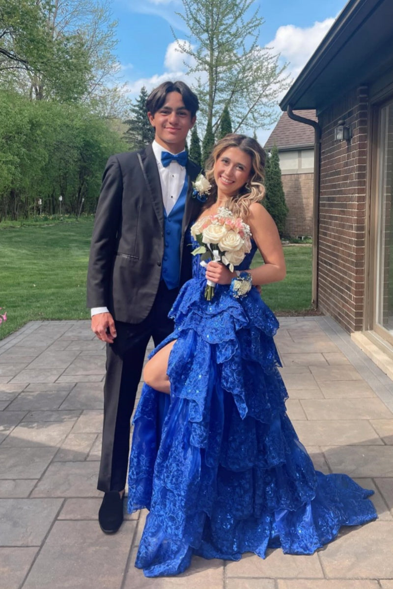 Straps Navy Blue Appliques Tulle Tiered Dress with Slit