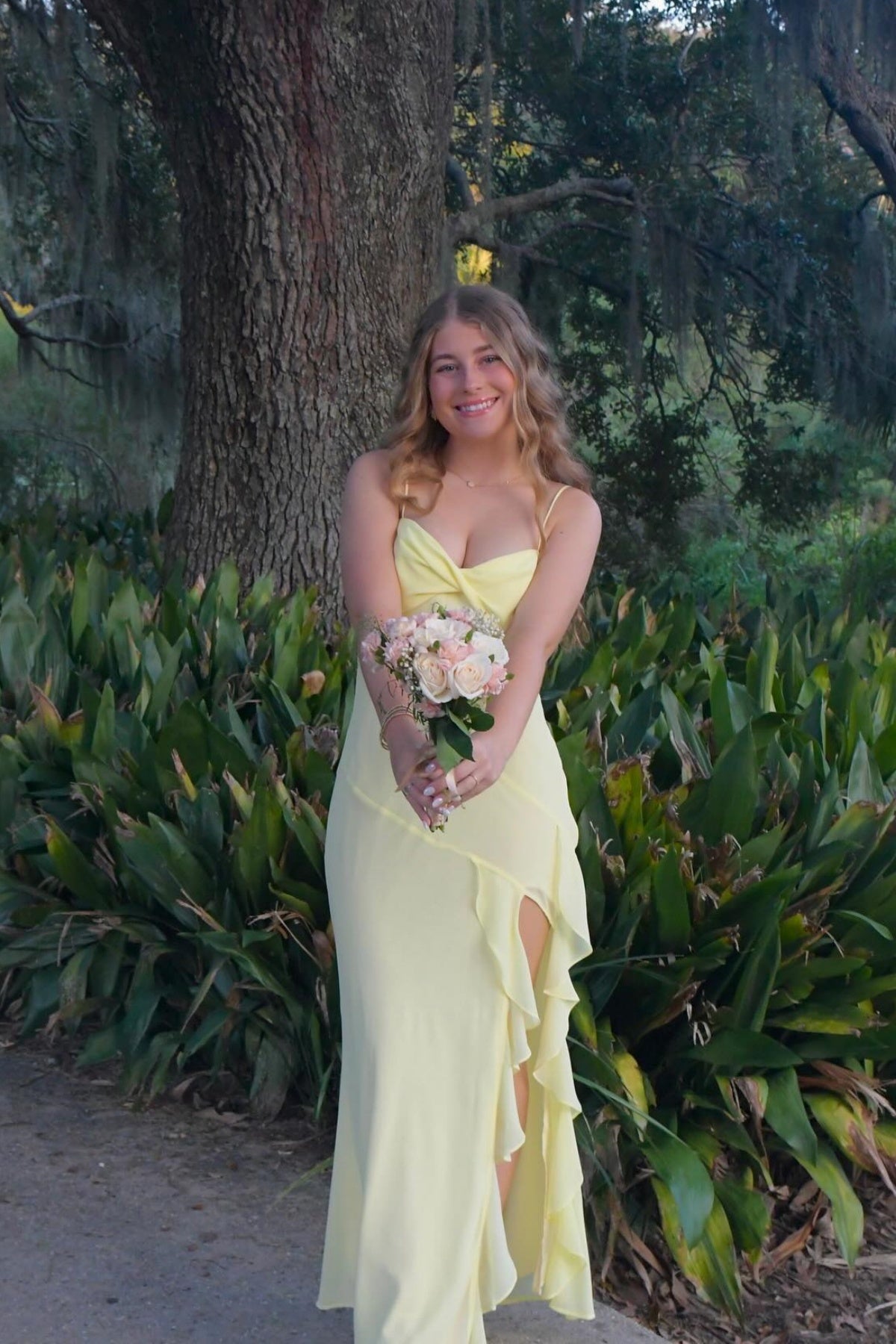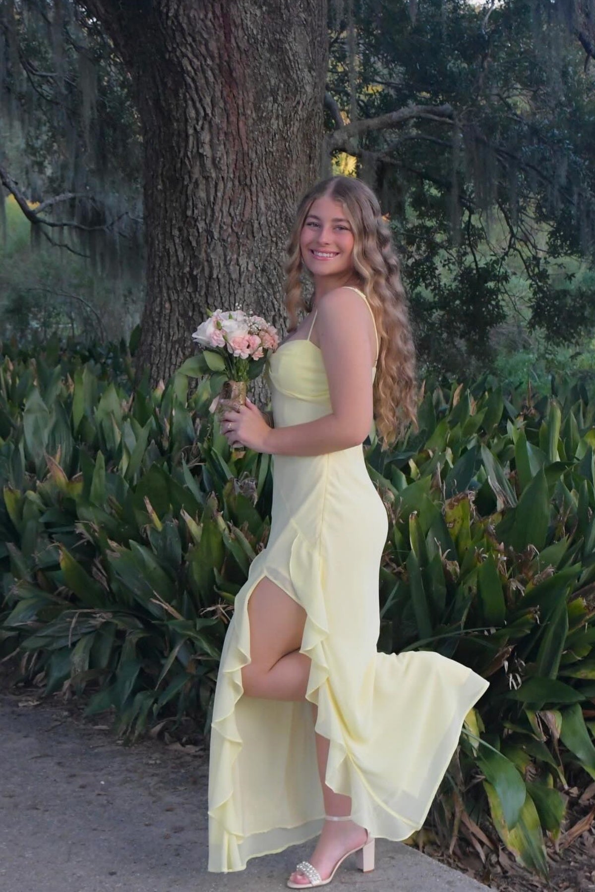 Constructed with chiffon material, this party dress boasts a fitted silhouette and delicate spaghetti straps. The side slit features ruffles, adding a playful touch to the full length design. Complete with a zip-up back for easy wear.