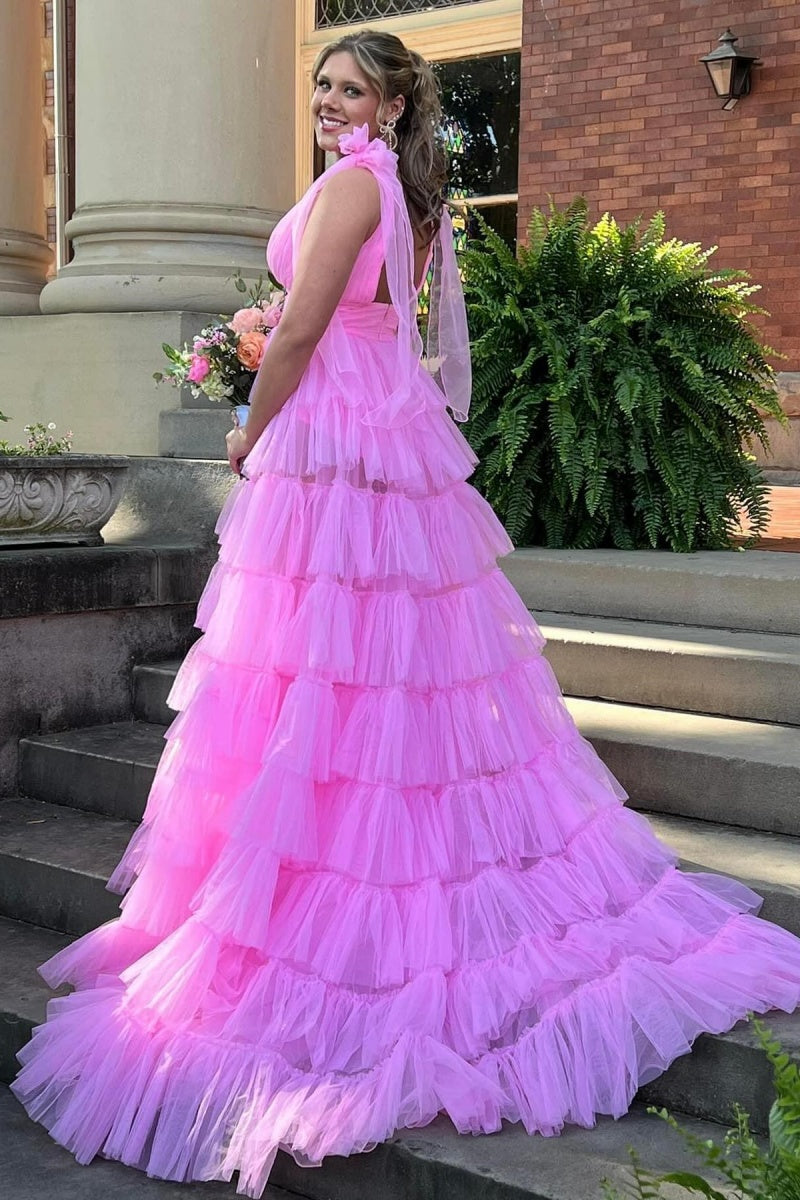 Tie Shoulders Yellow Tulle Ruffle Long Party Dress