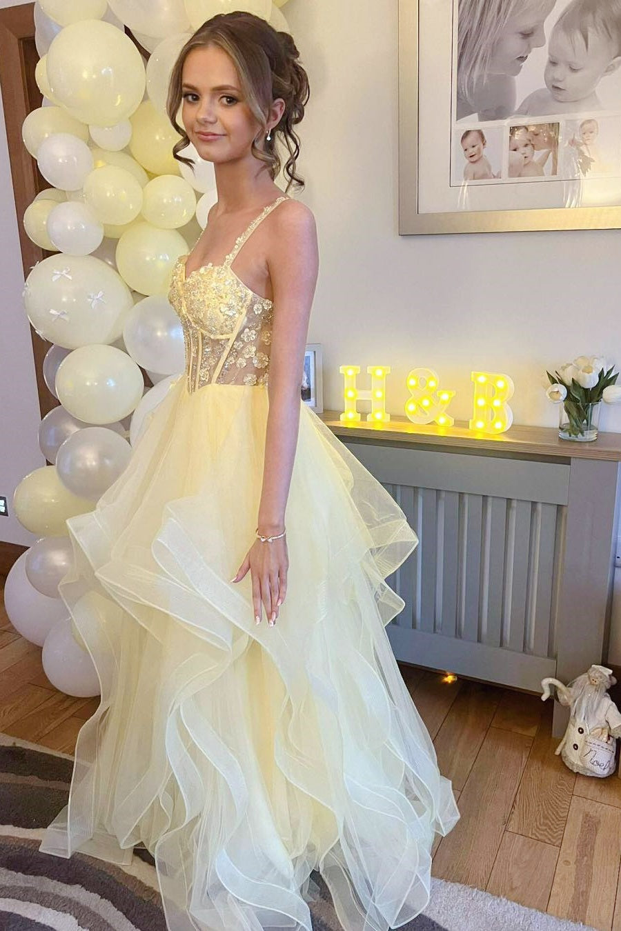 Yellow Sweetheart 3D Floral Spaghetti Straps A-line Dress