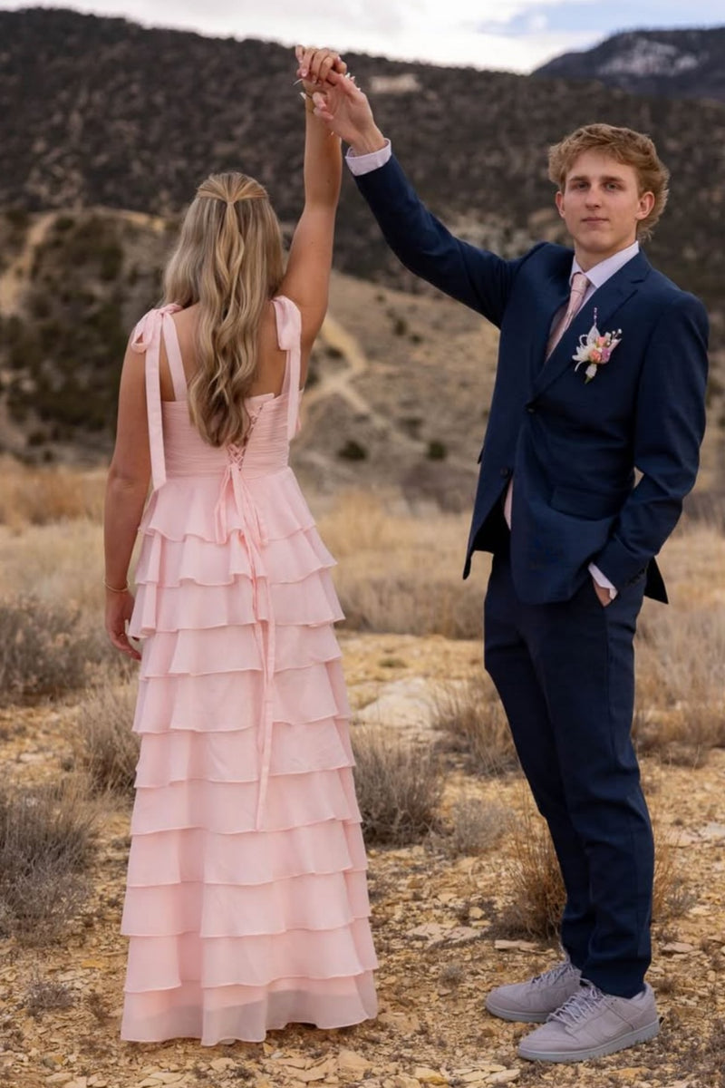 Pink Chiffon Bow Straps Ruffle A-Line Dress