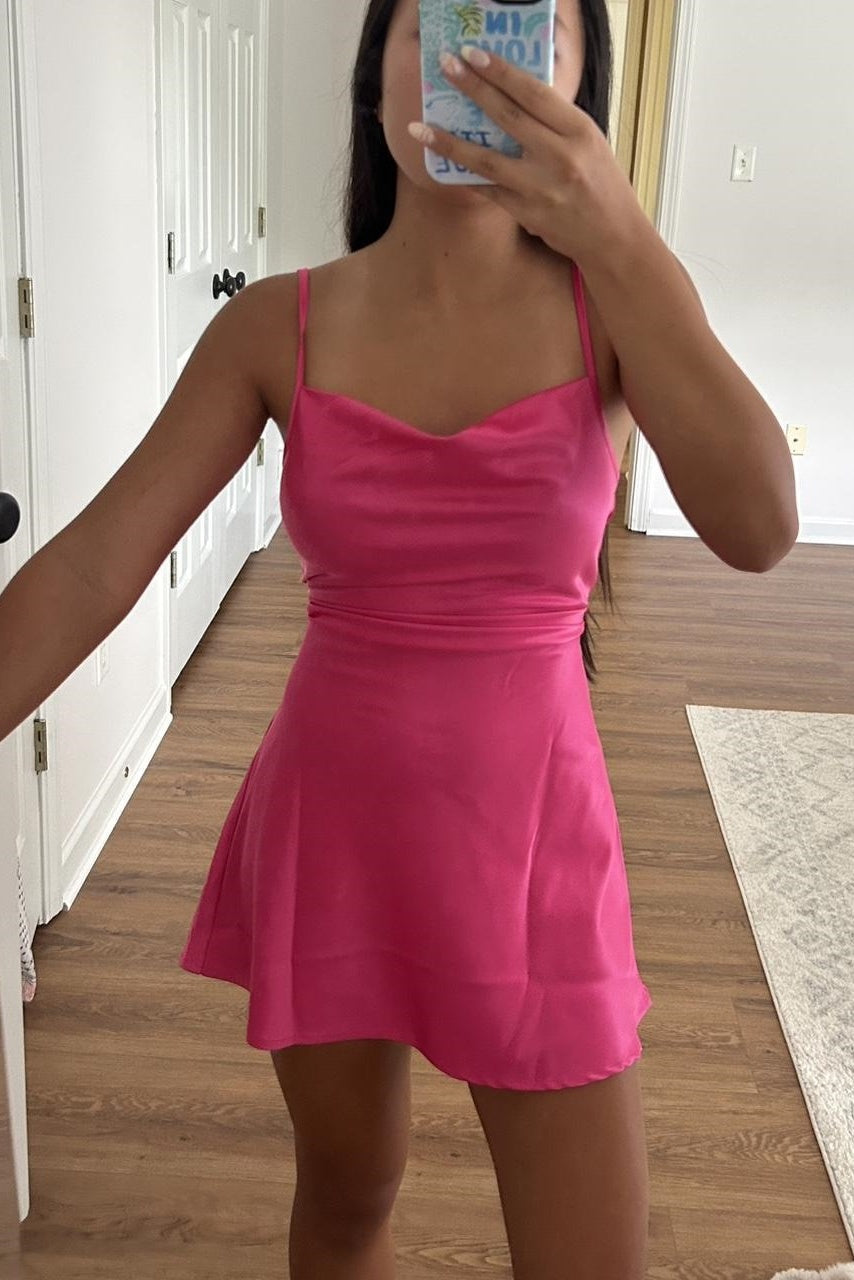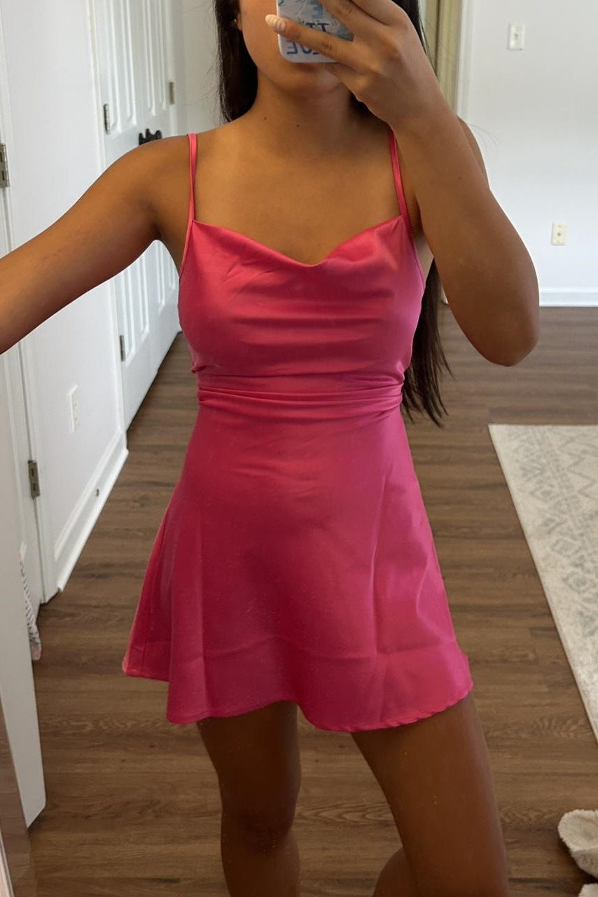 This vibrant pink mini dress features delicate spaghetti straps and a cowl neckline. Its A-line silhouette and non-stretch fabric create a flattering, structured fit perfect for stylish occasions.