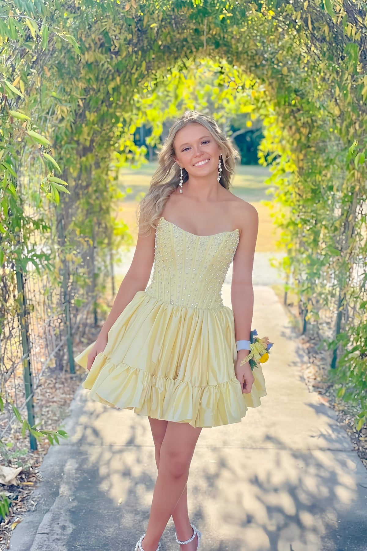 This light blue satin dress showcases an A-line silhouette with a strapless neckline. The bodice is adorned with pearl detailing, and the above-the-knee length is finished with a zip-up back for a secure fit.