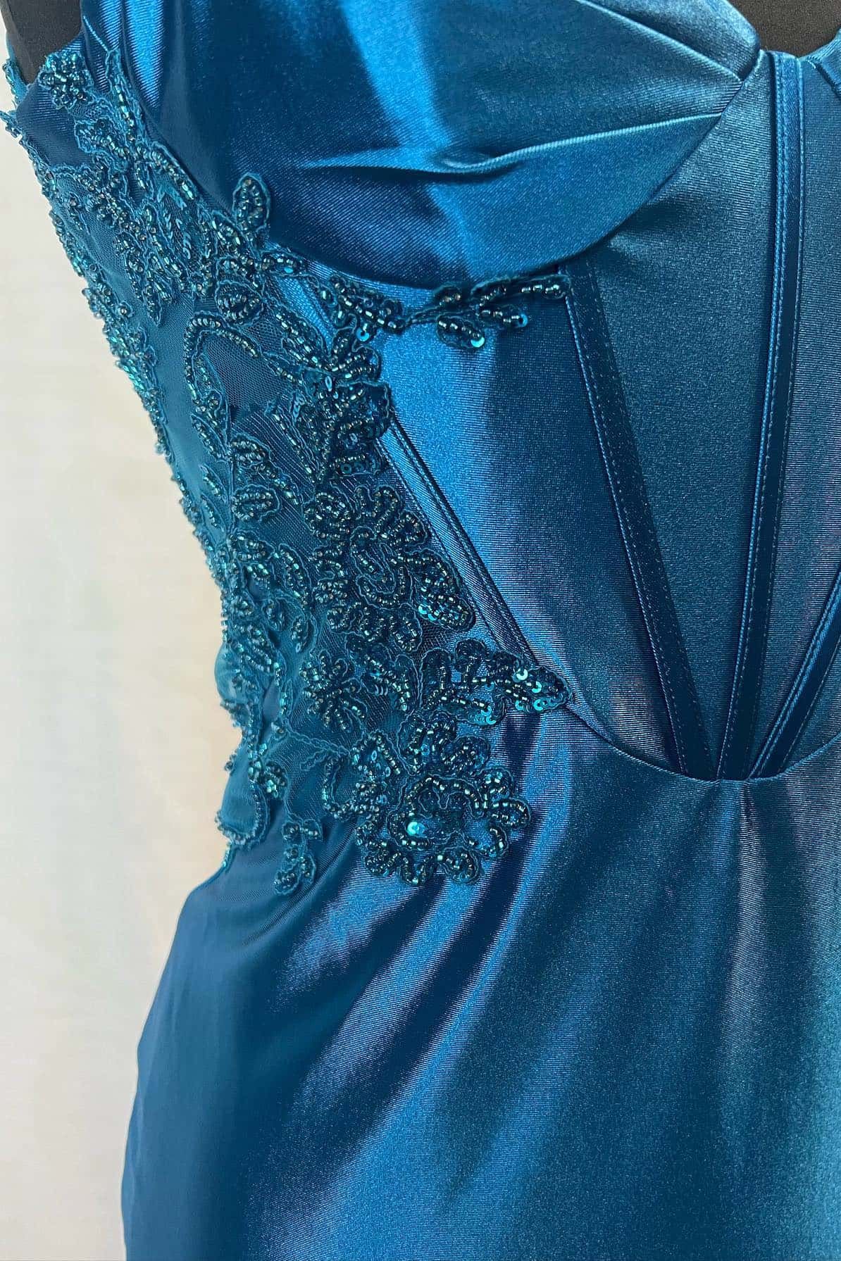 This royal blue mini dress features delicate spaghetti straps and a V-neckline crafted from smooth satin. The ruched bodice and corset-style top enhance the silhouette, while a floral appliqué adorns the side waist, adding an elegant touch to the navy blue design.