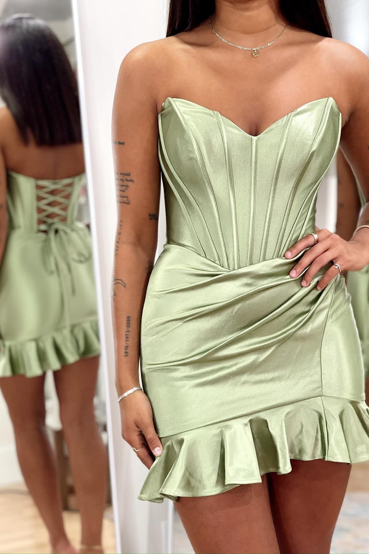 Strapless Hot Pink Satin Tight Short Ruffle Dress