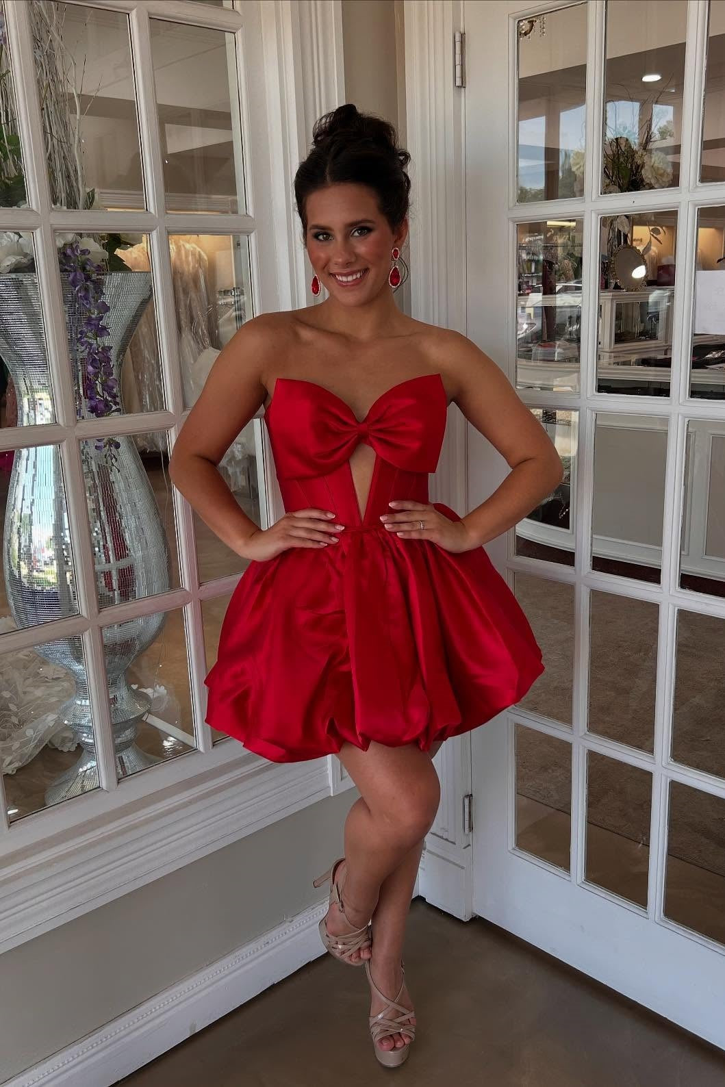 This red satin dress features an A-line silhouette with a strapless neckline and a bow detail at the front. The bubble skirt adds volume, while the lace-up back provides an adjustable fit. The dress falls above the knee for a chic and playful look.
