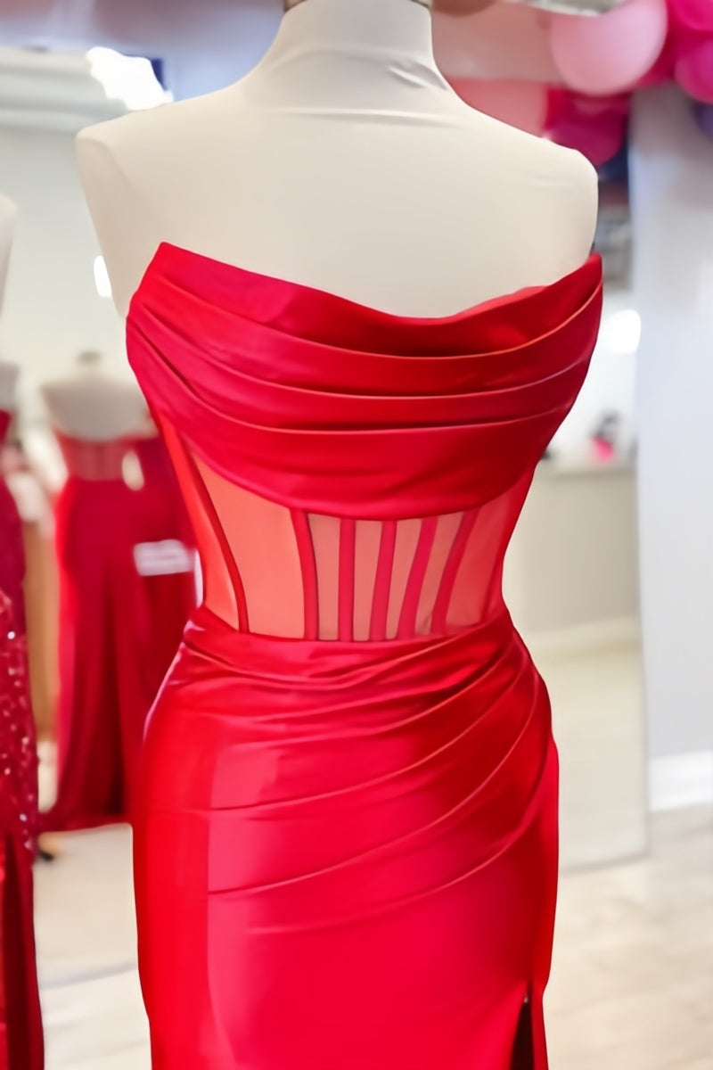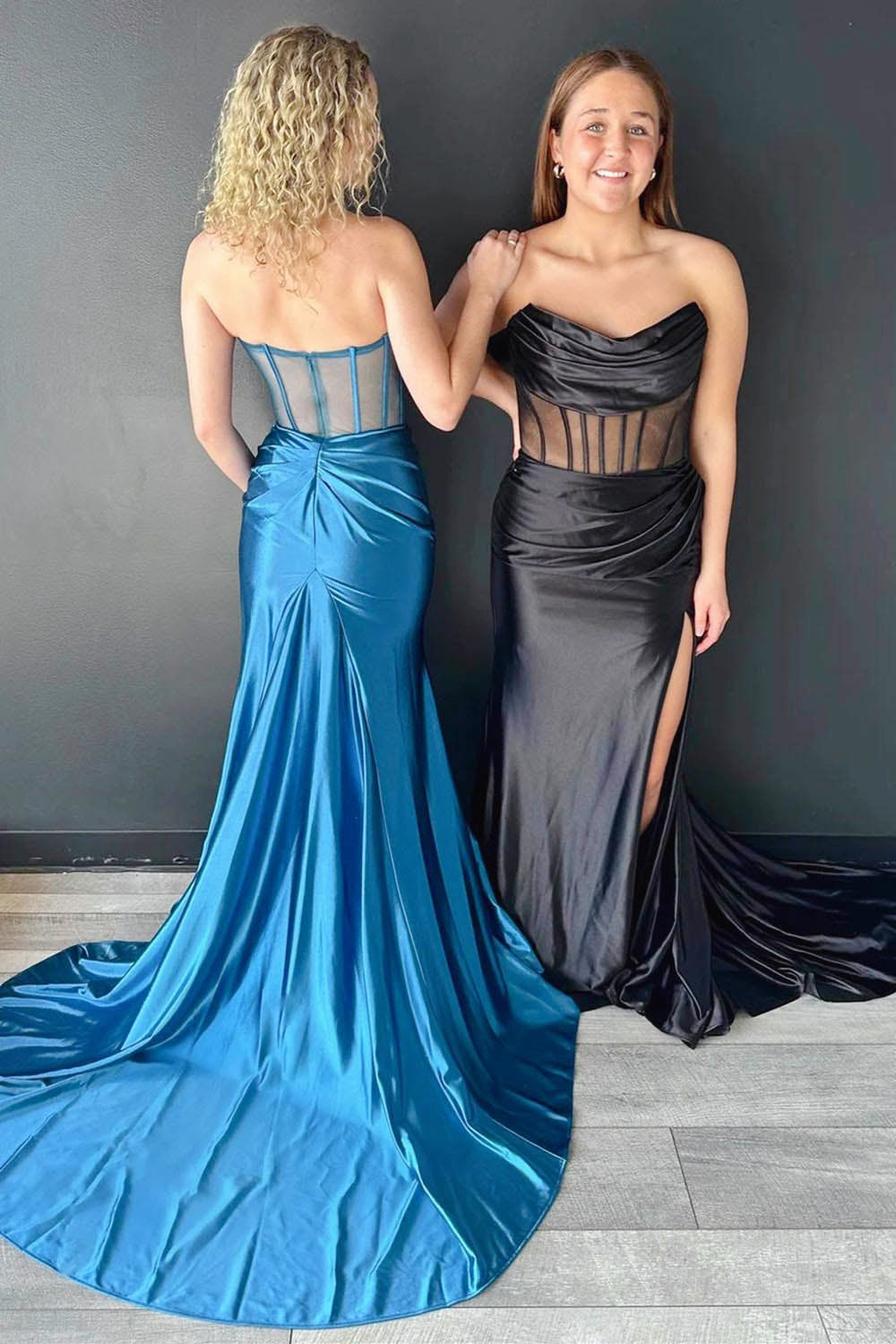 Sophisticated black formal dress in luxurious satin with a structured corset bodice and dramatic mermaid silhouette. The strapless design, high side slit, and zip-up back create an elegant statement piece for special occasions.