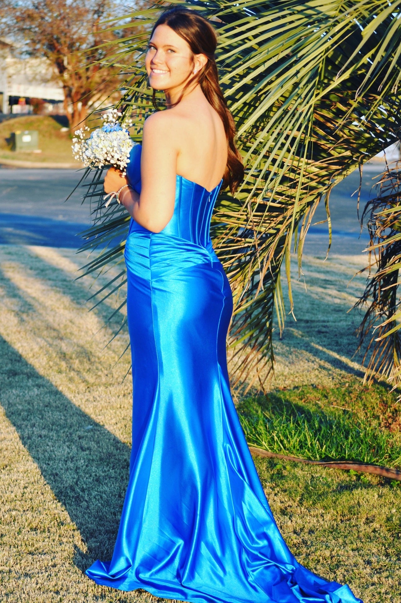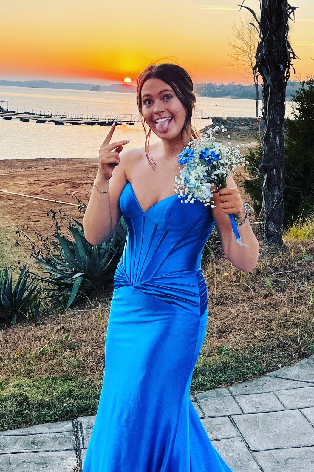 Blue satin mermaid dress with structured corset bodice, sweetheart neckline, and floor-length train. Back zipper closure for easy wear.