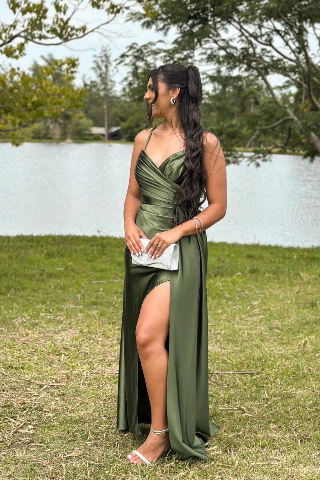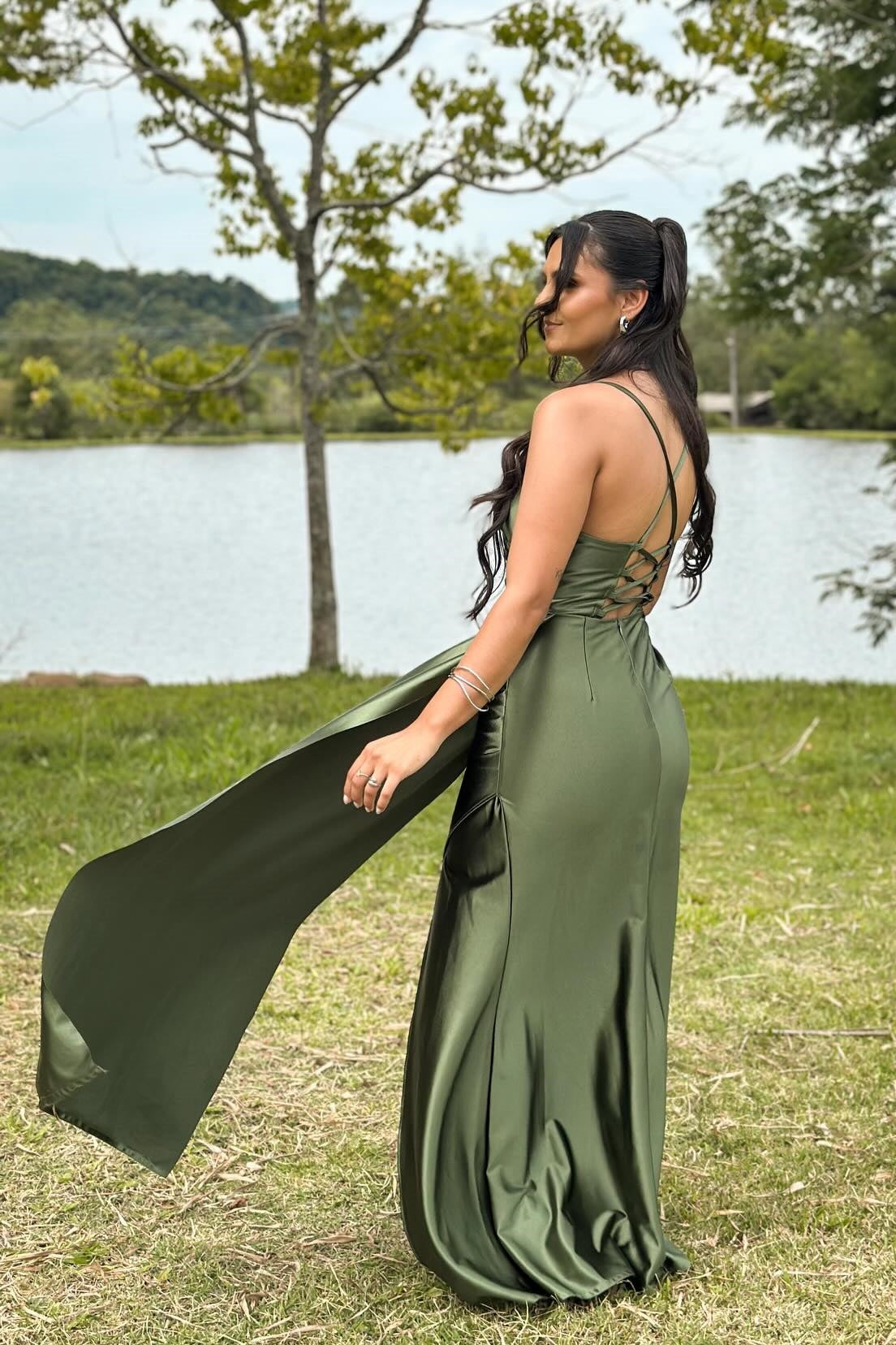 Olive Green Spaghetti Strap Slit Fitted Long Dress