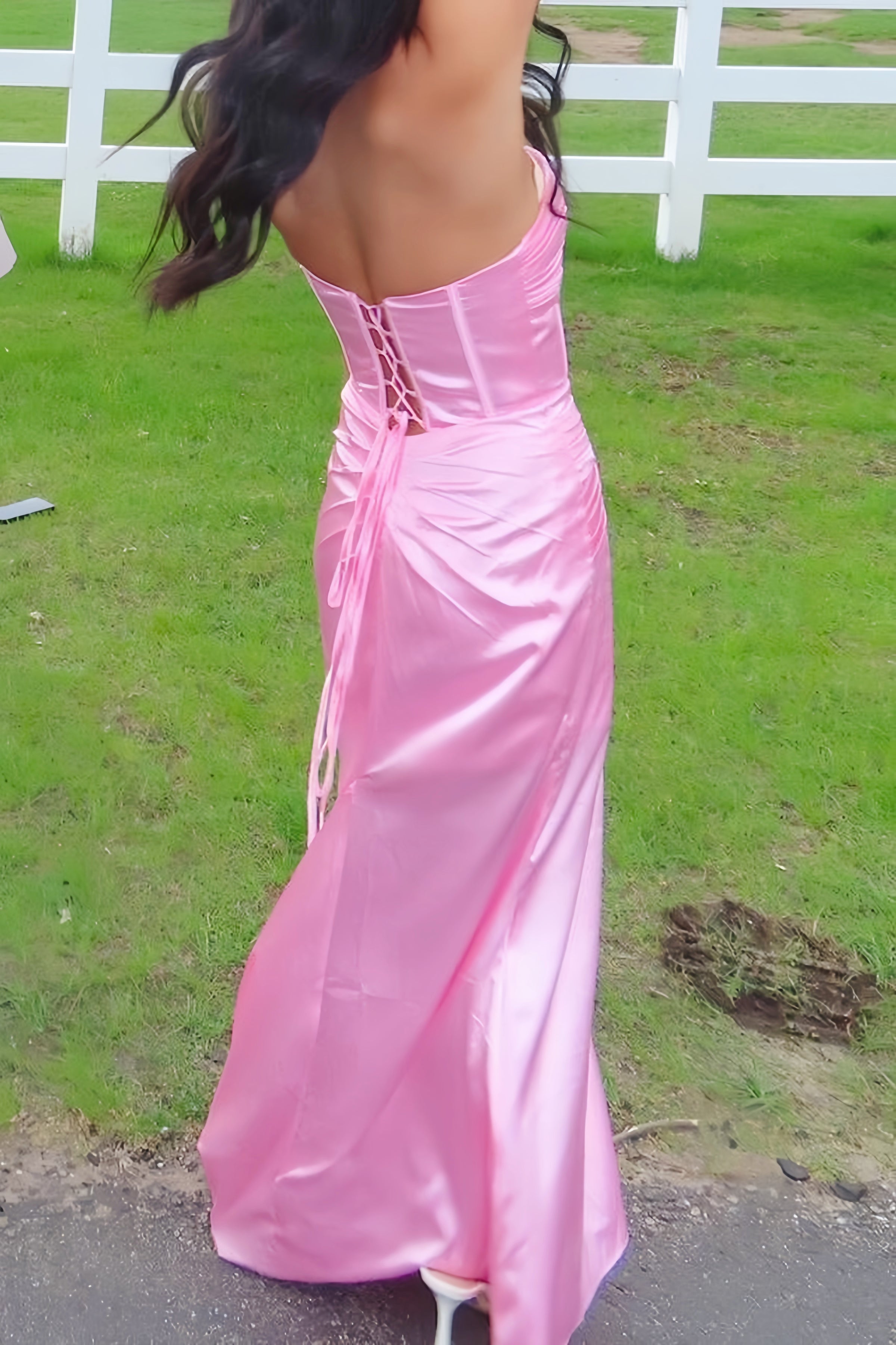 Crafted from luxurious satin, this floor-length prom dress features an elegant A-line silhouette that flatters every figure. The distinctive twist sweetheart neckline adds sophisticated detail, while a practical side slit ensures graceful movement. The flowing hem cascades to the floor, creating a polished, refined look perfect for formal occasions.