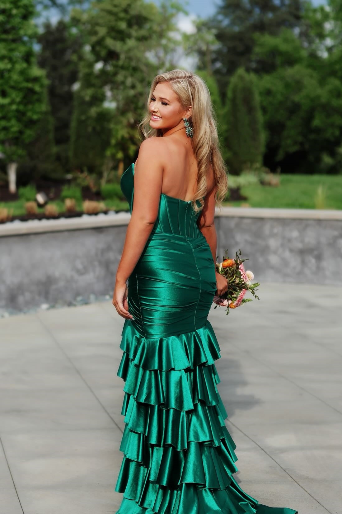 Strapless Green Satin Fitted Ruffle Prom Dress