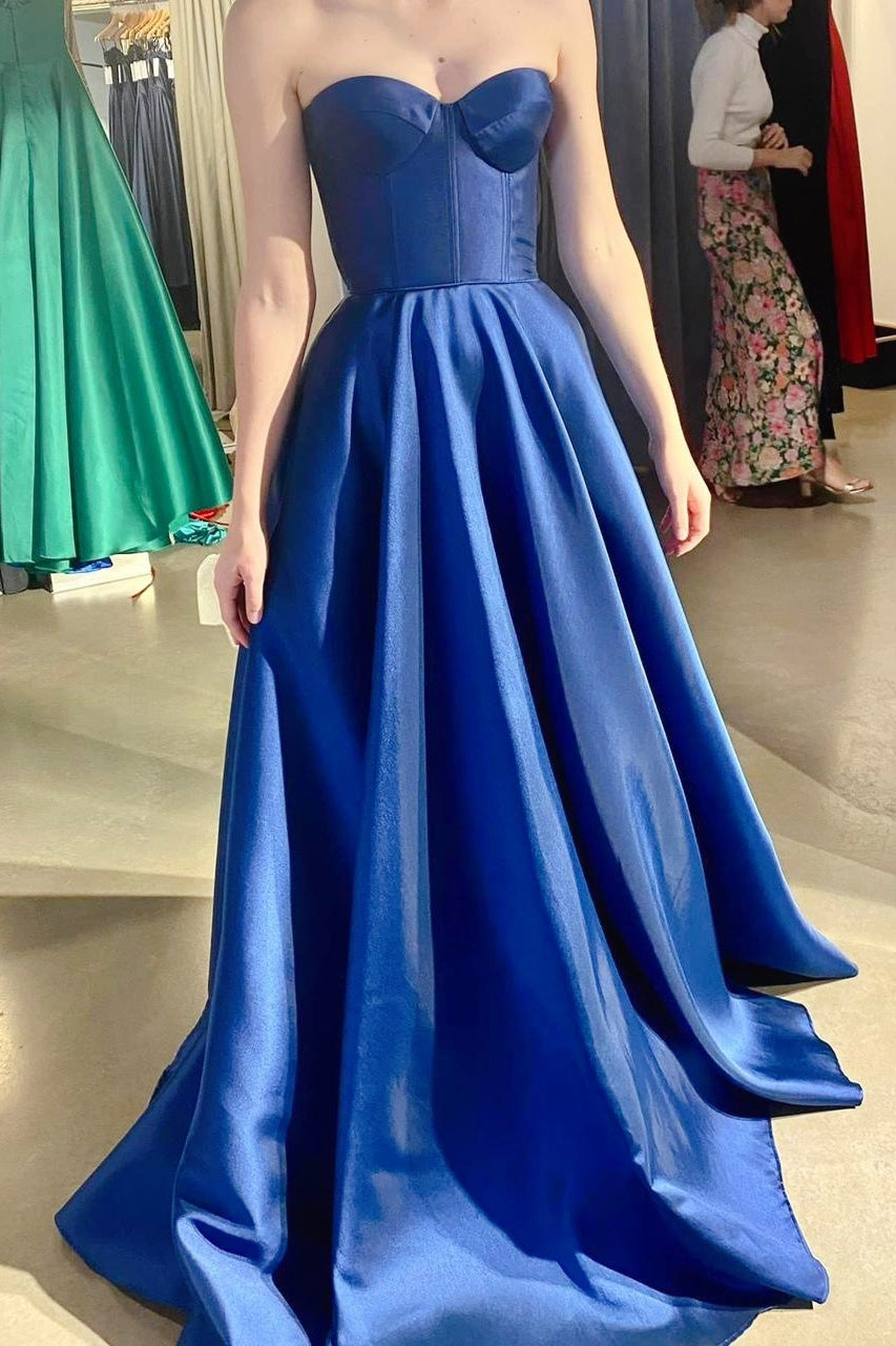 Strapless Royal Blue Satin A-line Long Formal Gown
