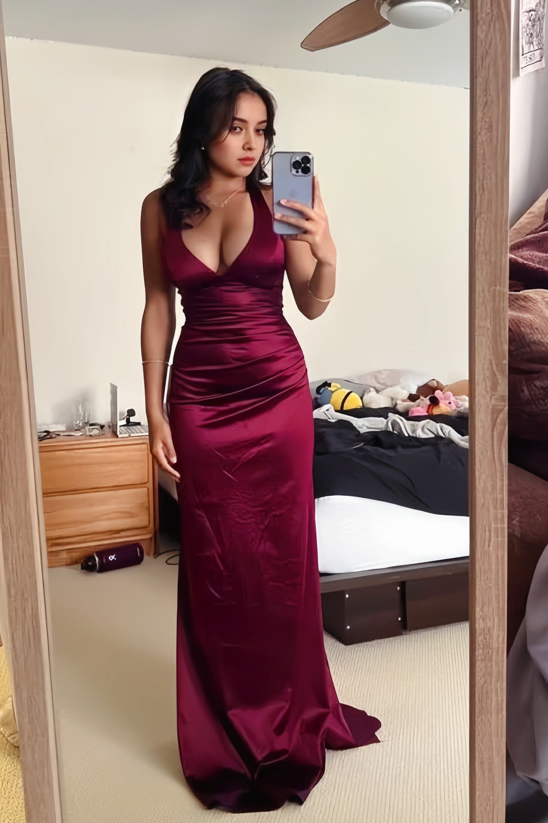This stylish party dress has a Satin material with a beautiful Burgundy color, creating a flattering Sheath silhouette. The V Neck adds a touch of elegance, while the Empire waistline and Cross cross tie in the back provide a perfect fit. It is designed with a full length for a sophisticated look.