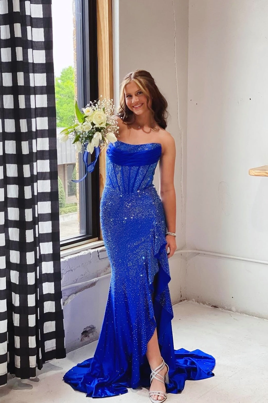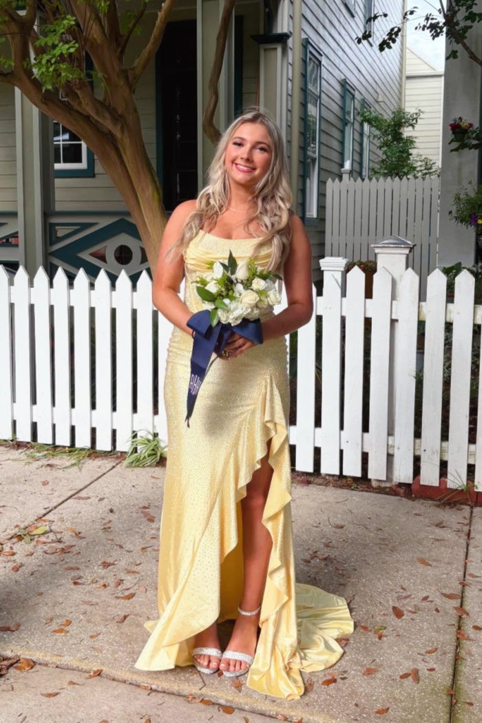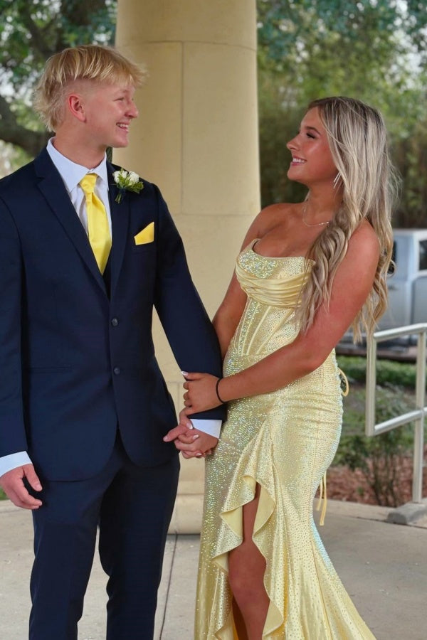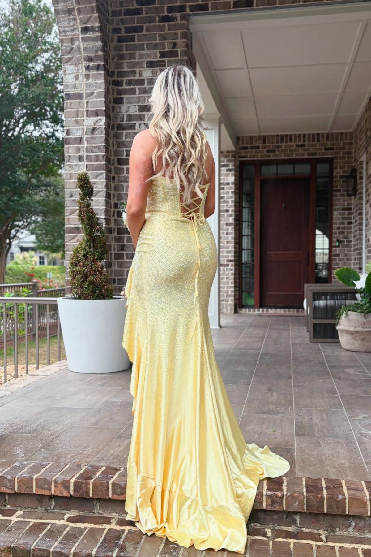 This stunning yellow mermaid gown features a fully beaded corset bodice with structured boning and a strapless neckline. The luxurious satin fabric flows into a dramatic floor-length silhouette with an elegant train, while a ruffled side slit and lace-up back add sophisticated detail.