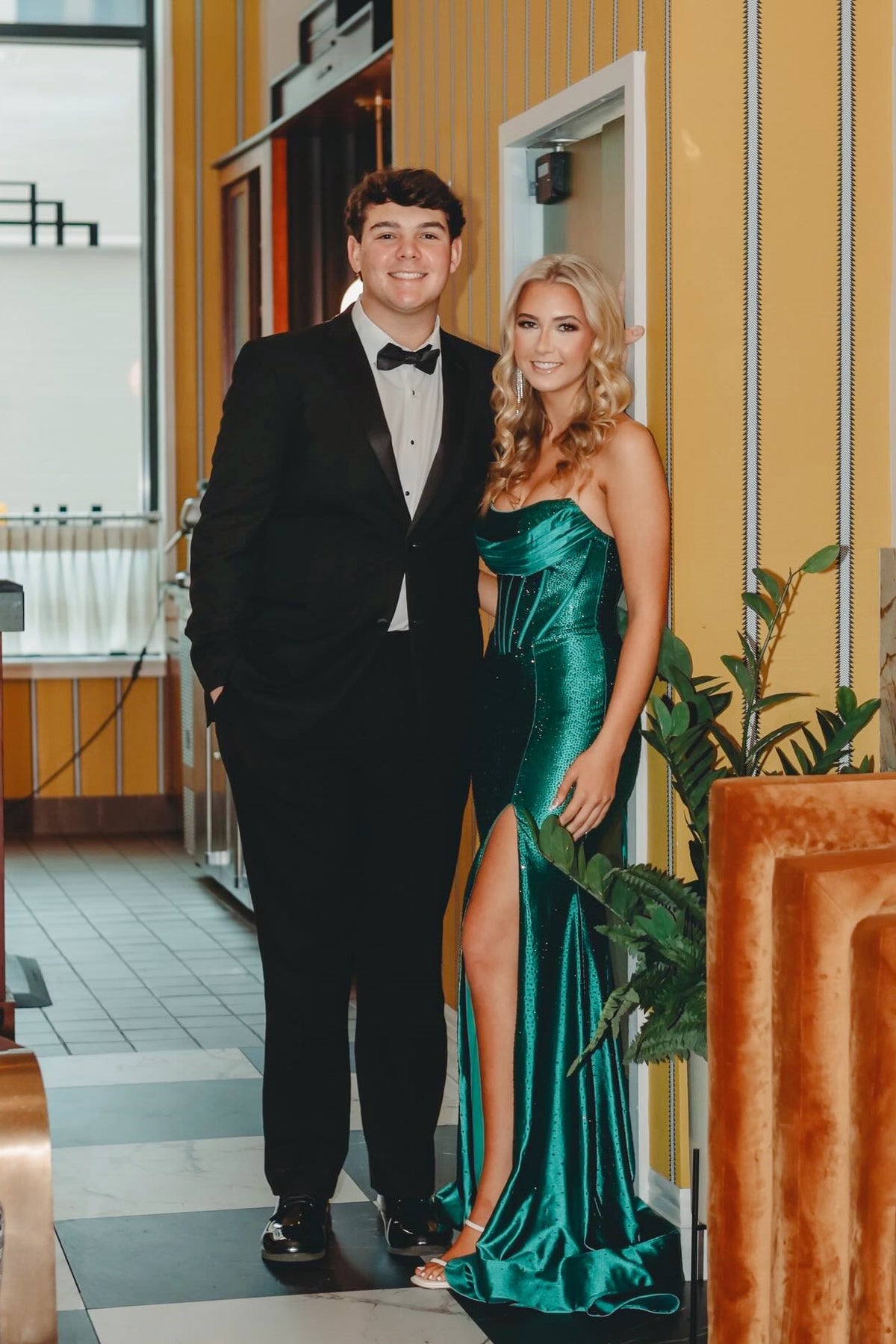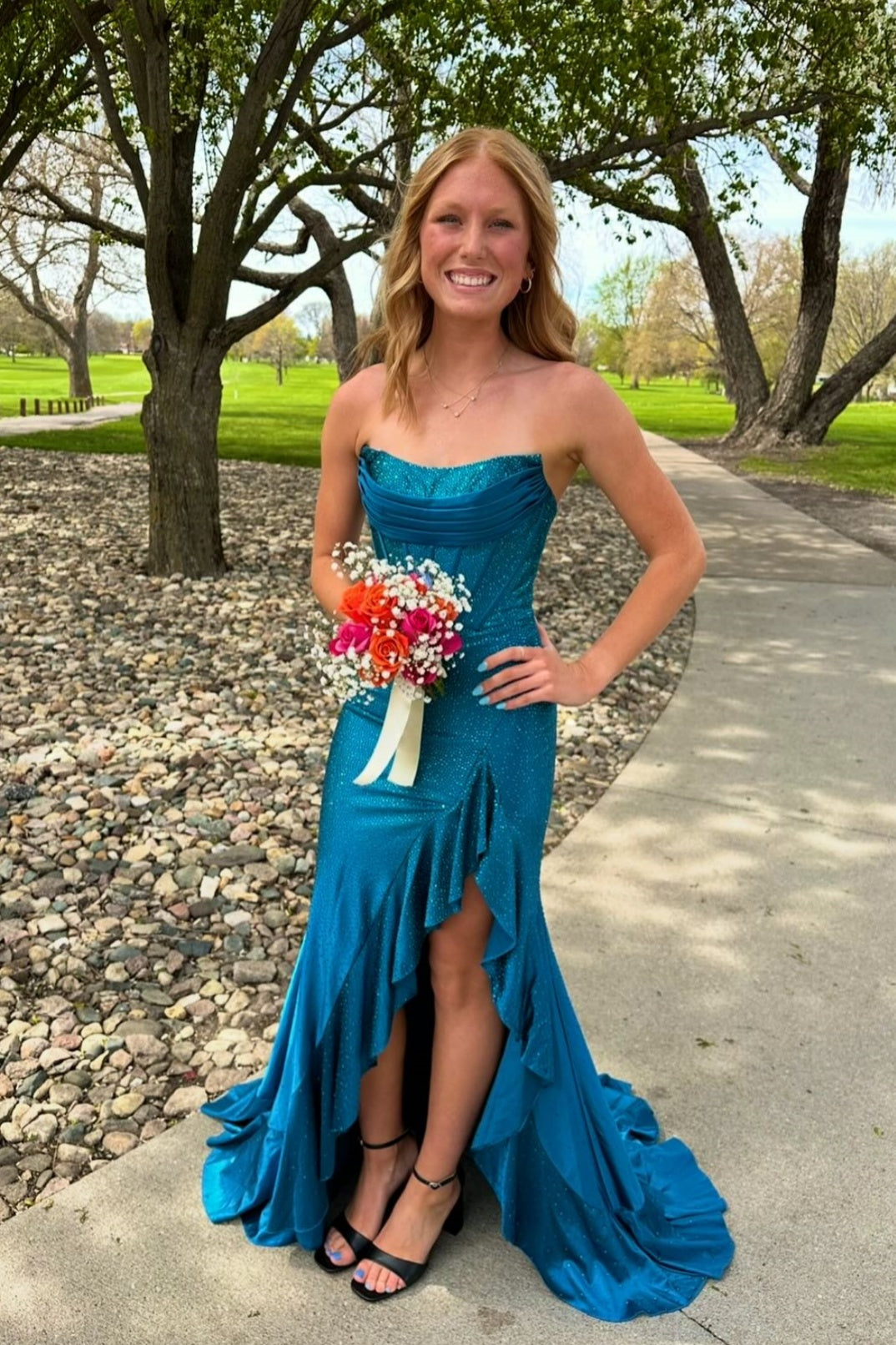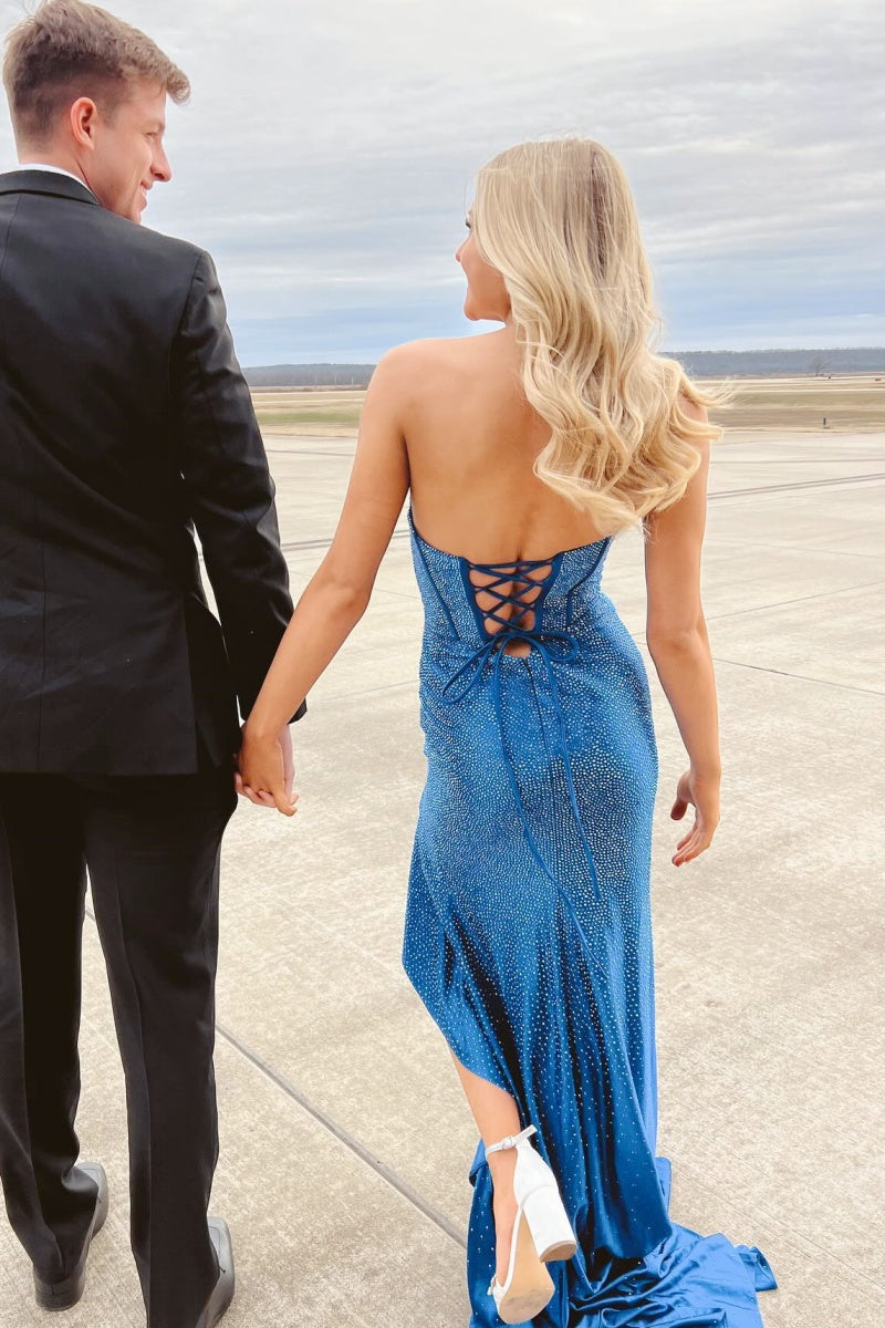 This stunning yellow mermaid gown features a fully beaded corset bodice with structured boning and a strapless neckline. The luxurious satin fabric flows into a dramatic floor-length silhouette with an elegant train, while a ruffled side slit and lace-up back add sophisticated detail.