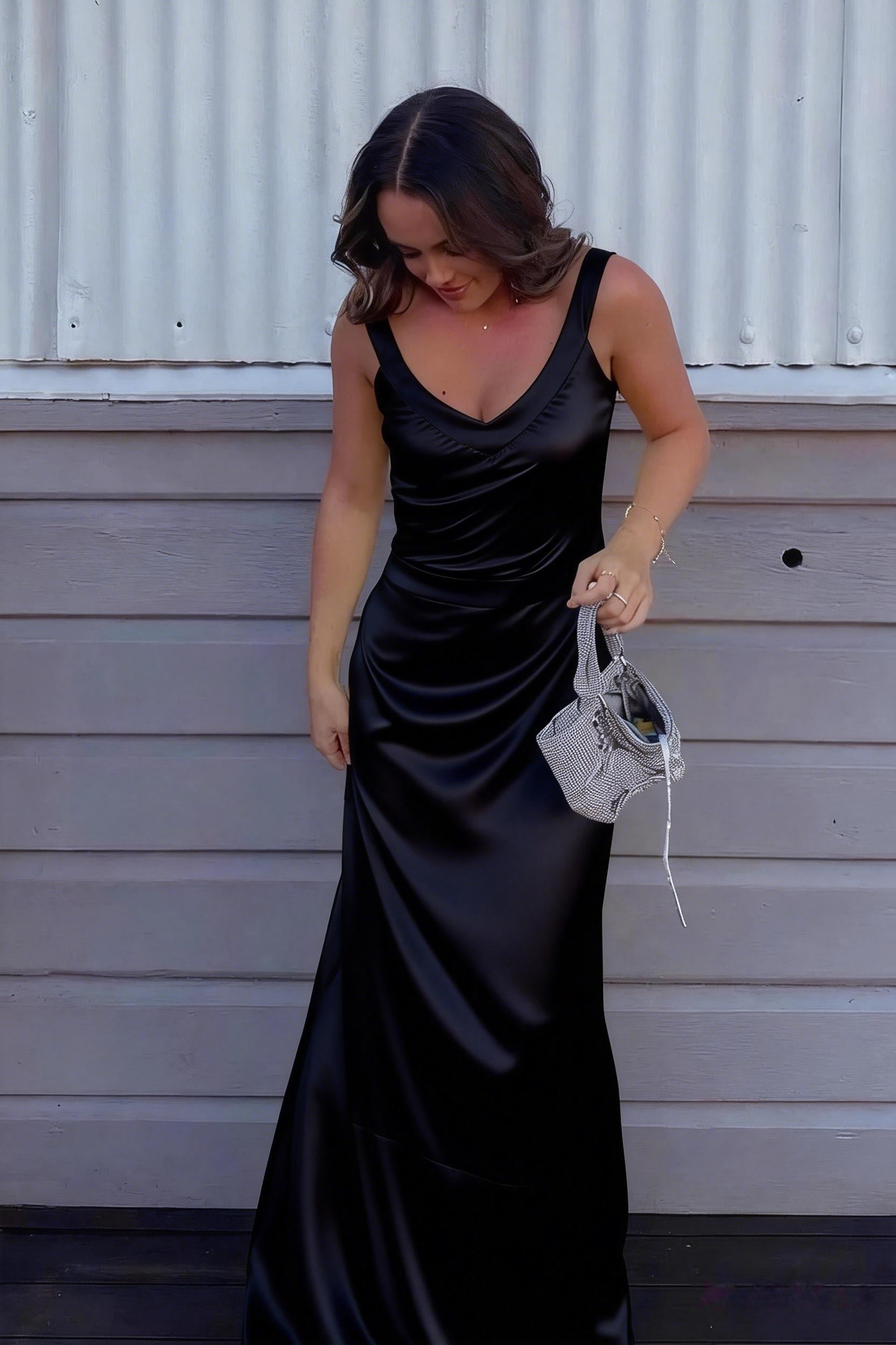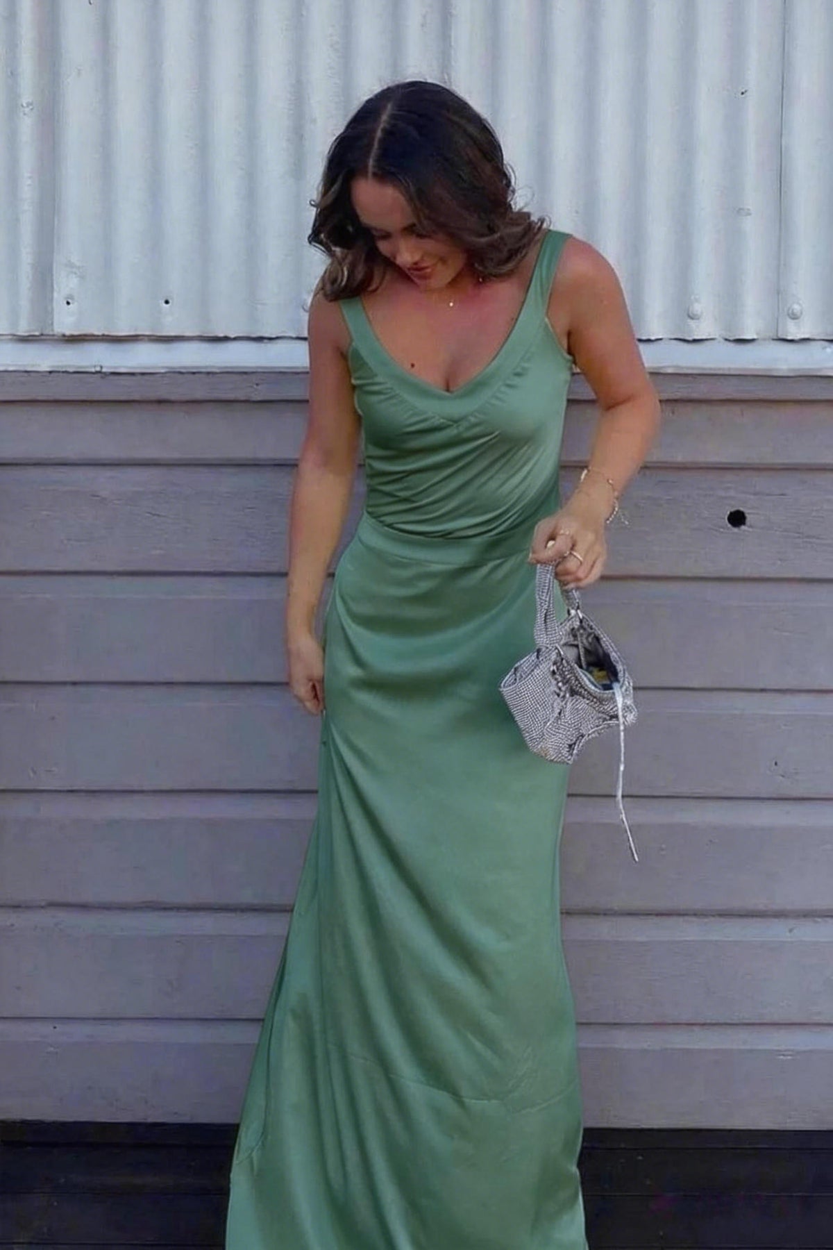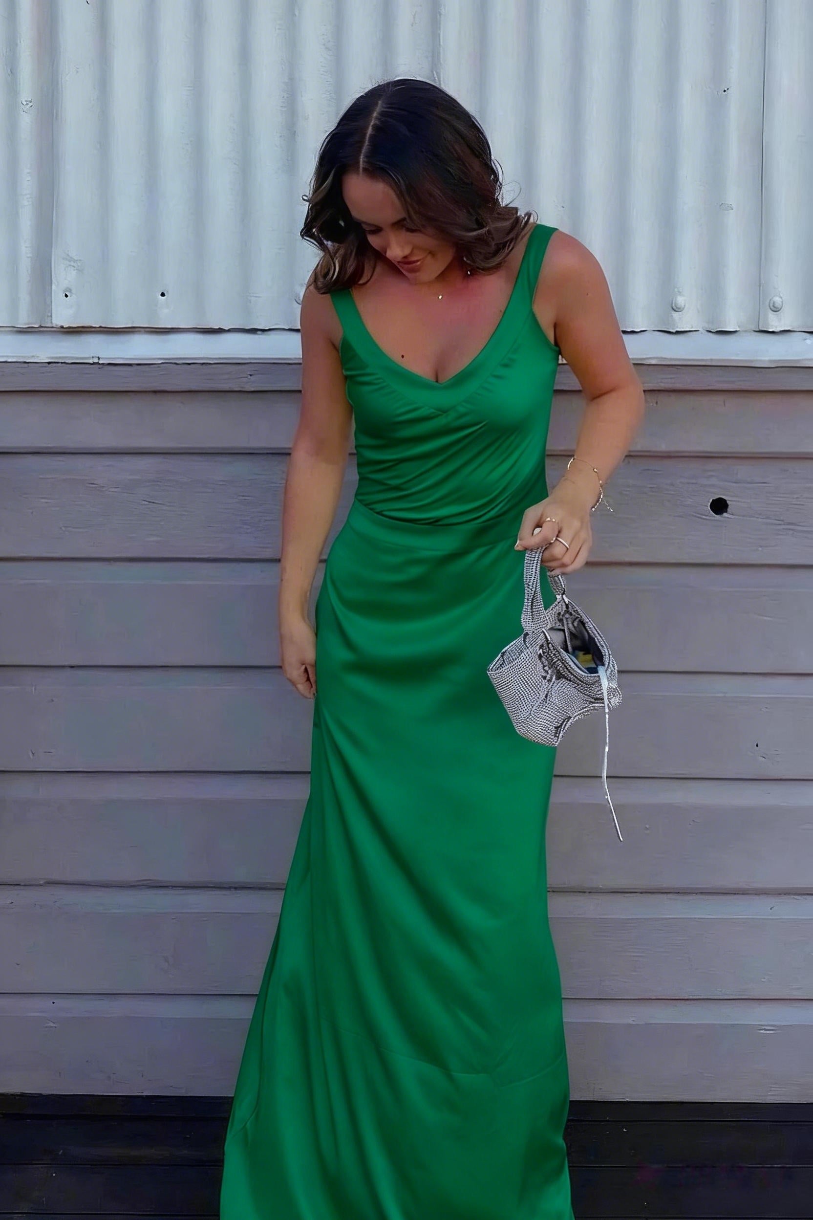 The dress boasts a sheath silhouette with a V-neckline and a stunning cross back detail. Made from a luxurious satin material in a rich green hue, it drapes gracefully and exudes elegance. The full length design adds a touch of sophistication to any occasion.