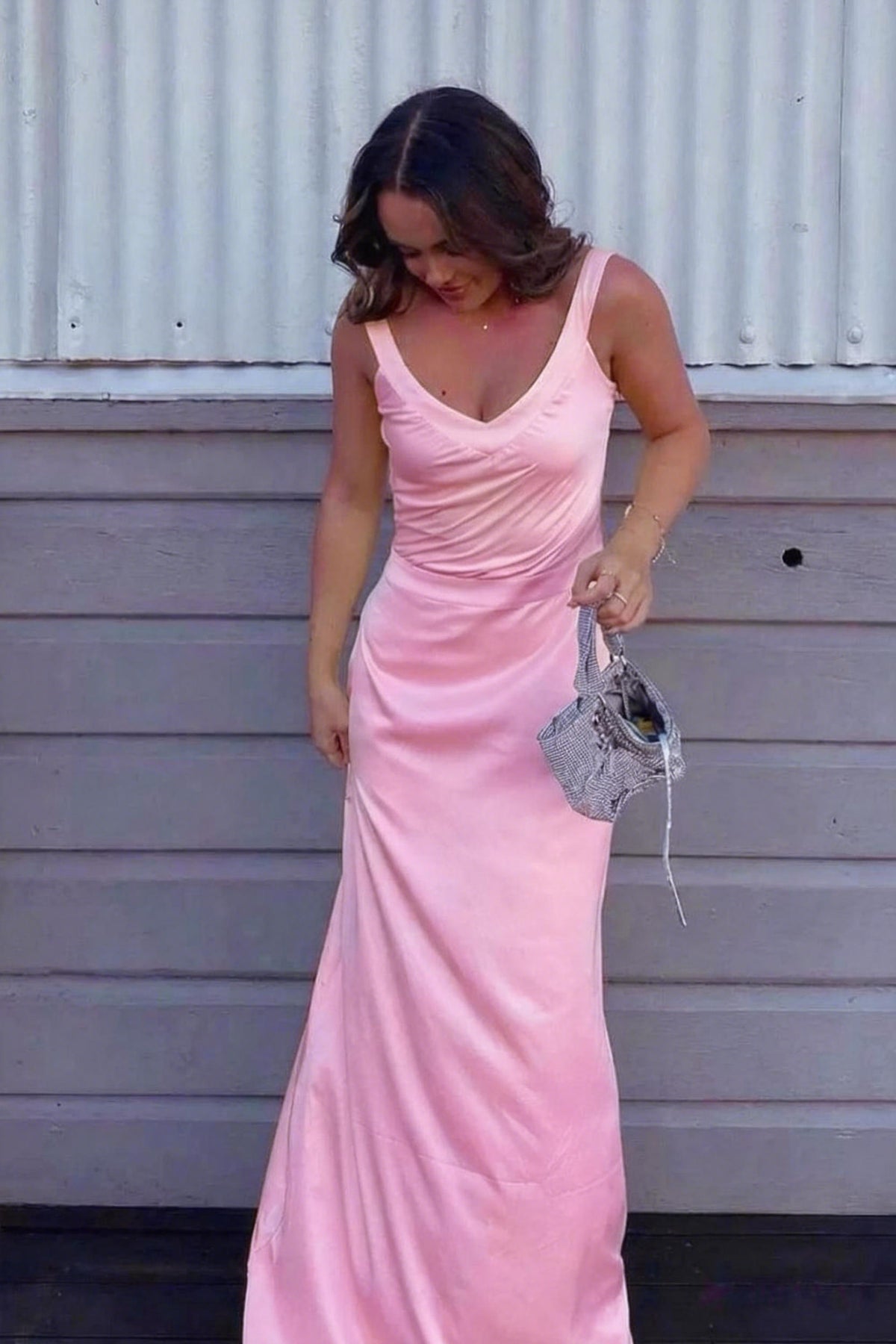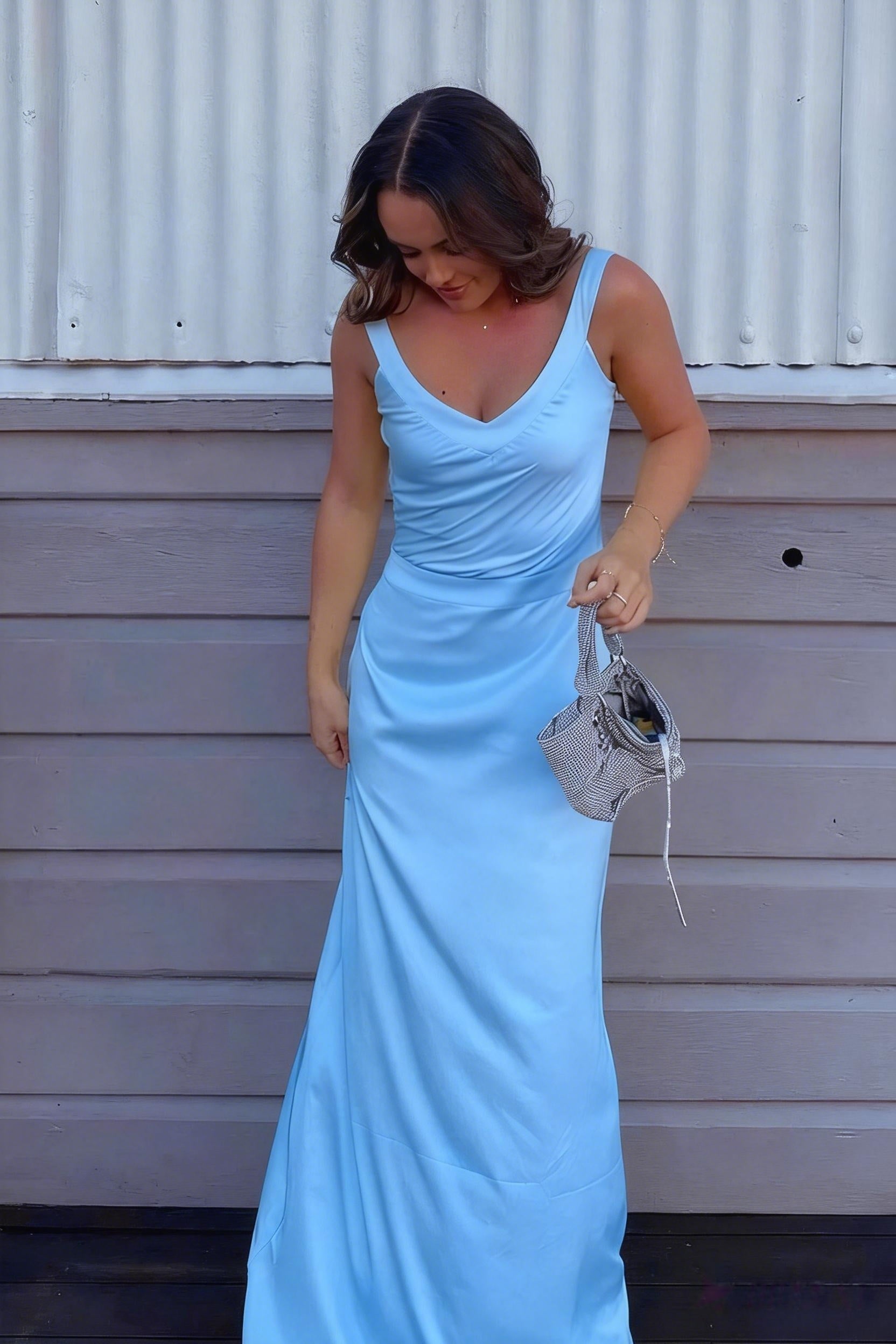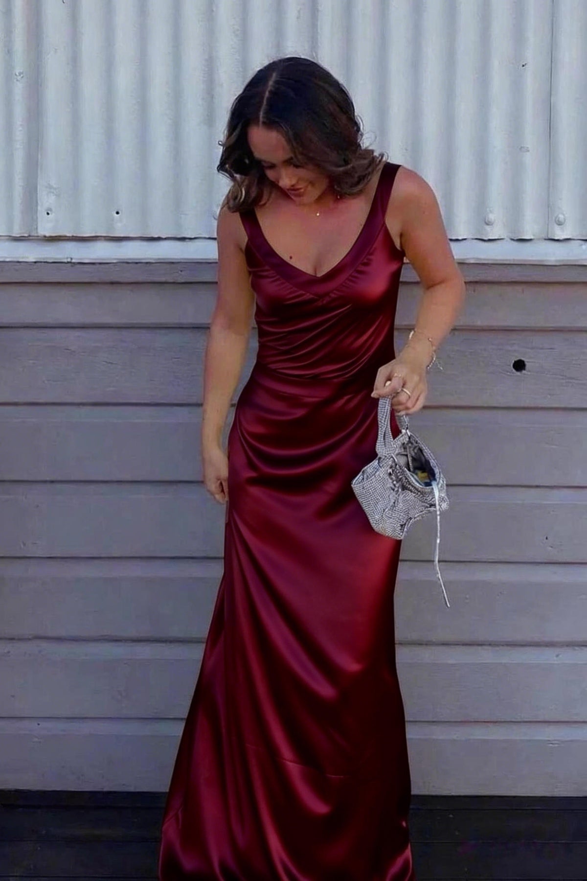 The dress boasts a sheath silhouette with a V-neckline and a stunning cross back detail. Made from a luxurious satin material in a rich green hue, it drapes gracefully and exudes elegance. The full length design adds a touch of sophistication to any occasion.