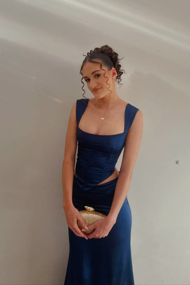Stunning two-piece yellow satin mermaid dress featuring a square-neck crop top with wide straps, exposed waist, and flowing floor-length skirt. The tie-back detail adds elegance and sophistication to this show-stopping party look.