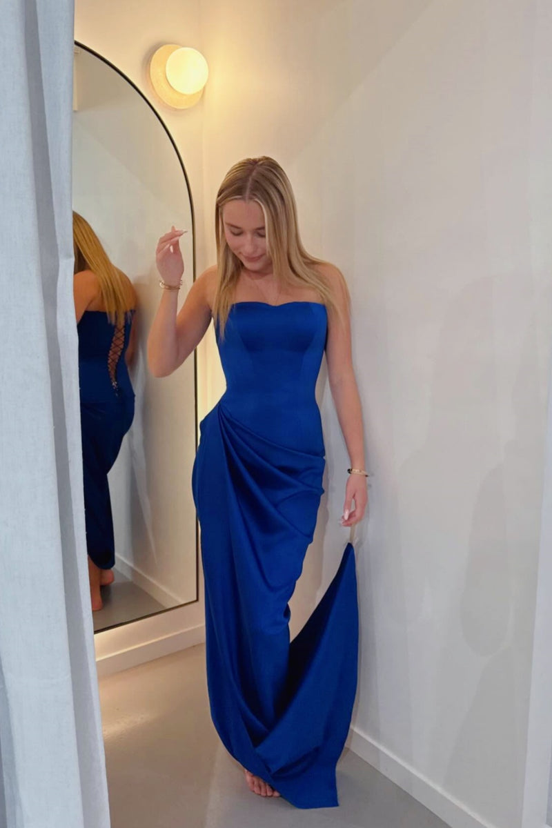 Strapless Royal Blue Appliques Satin Mermaid Long Formal Dress