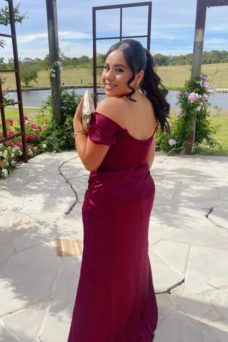 Burgundy Off-the-shoulder Side Slit Long Dress