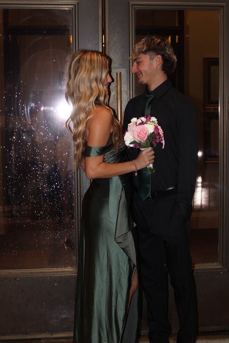 Dark Green Off the Shoulder Frill Slit Long Dress